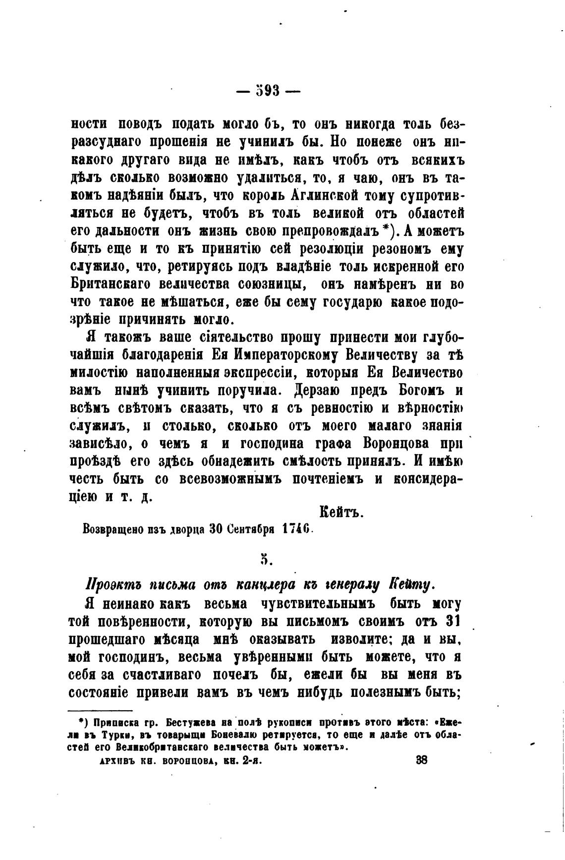 Возвращено изъ дворца 30 Сентября 1746