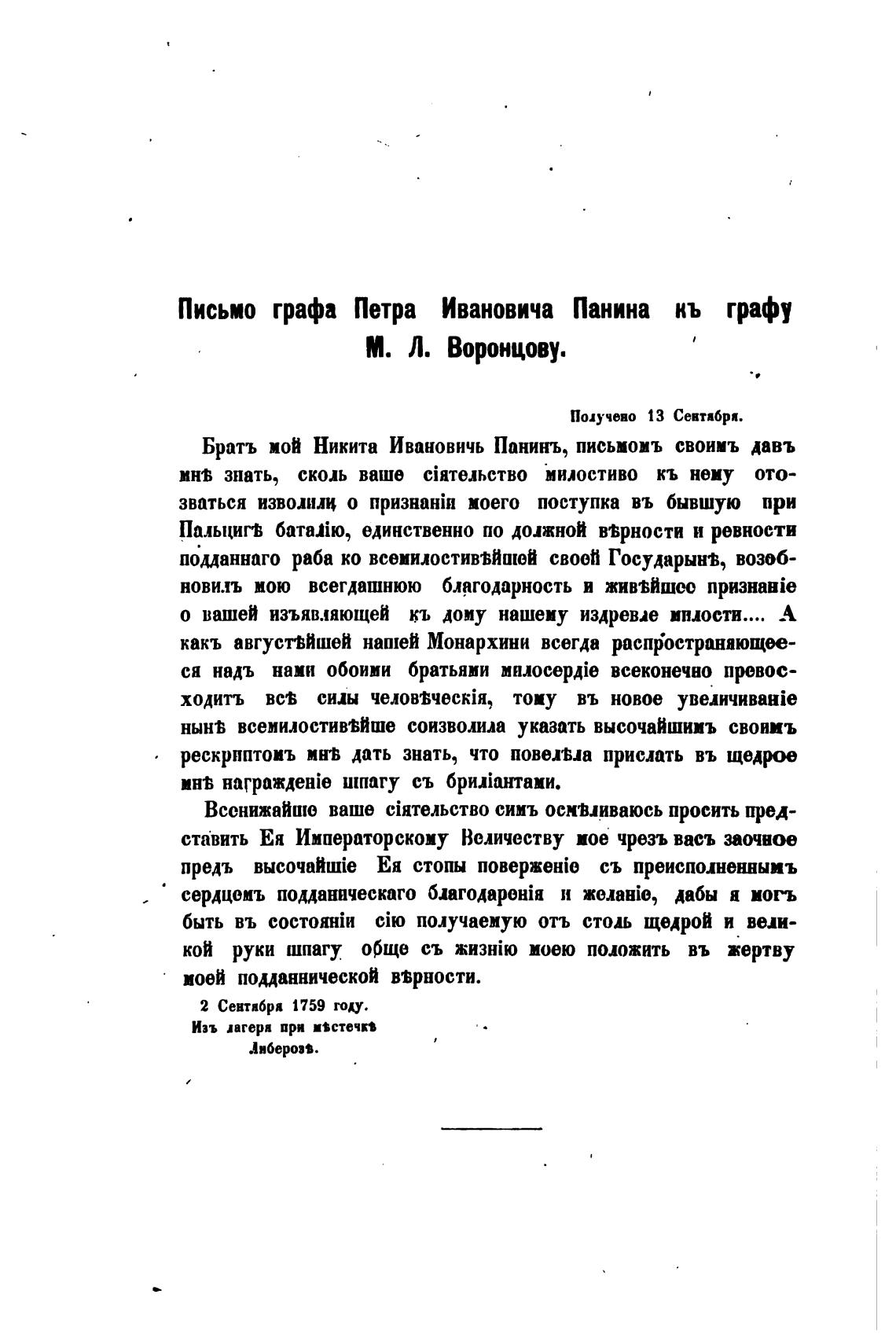 Письмо графа Петра Ивановича Панина кь графу