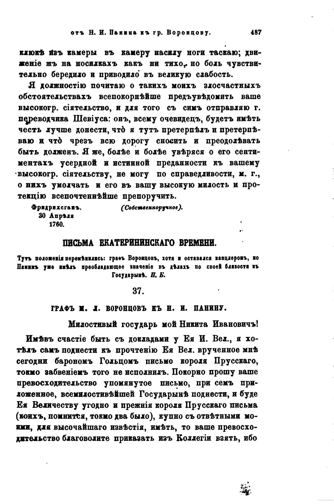 ТРАФЬ П. Х. ВОРОНЦОВЪ КЬ Н. И. ПАНИНУ.