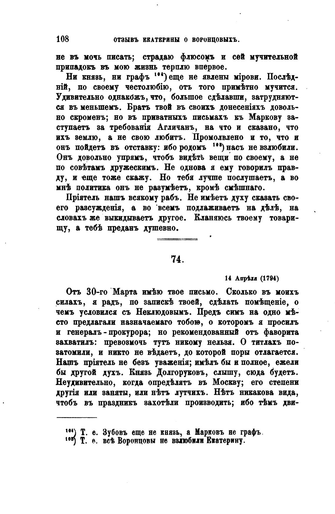 отзывъ ЕКАТЕРИНЫ о воронцовыхъ.