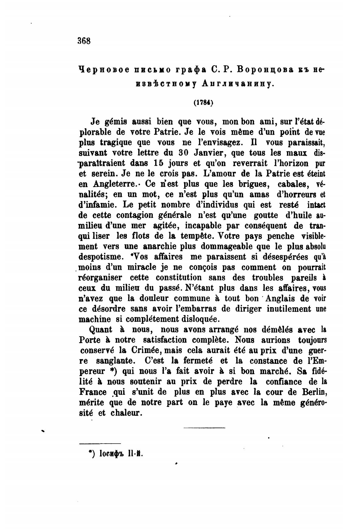 Черновое письмо графа С. Р. Воронцова въ не-