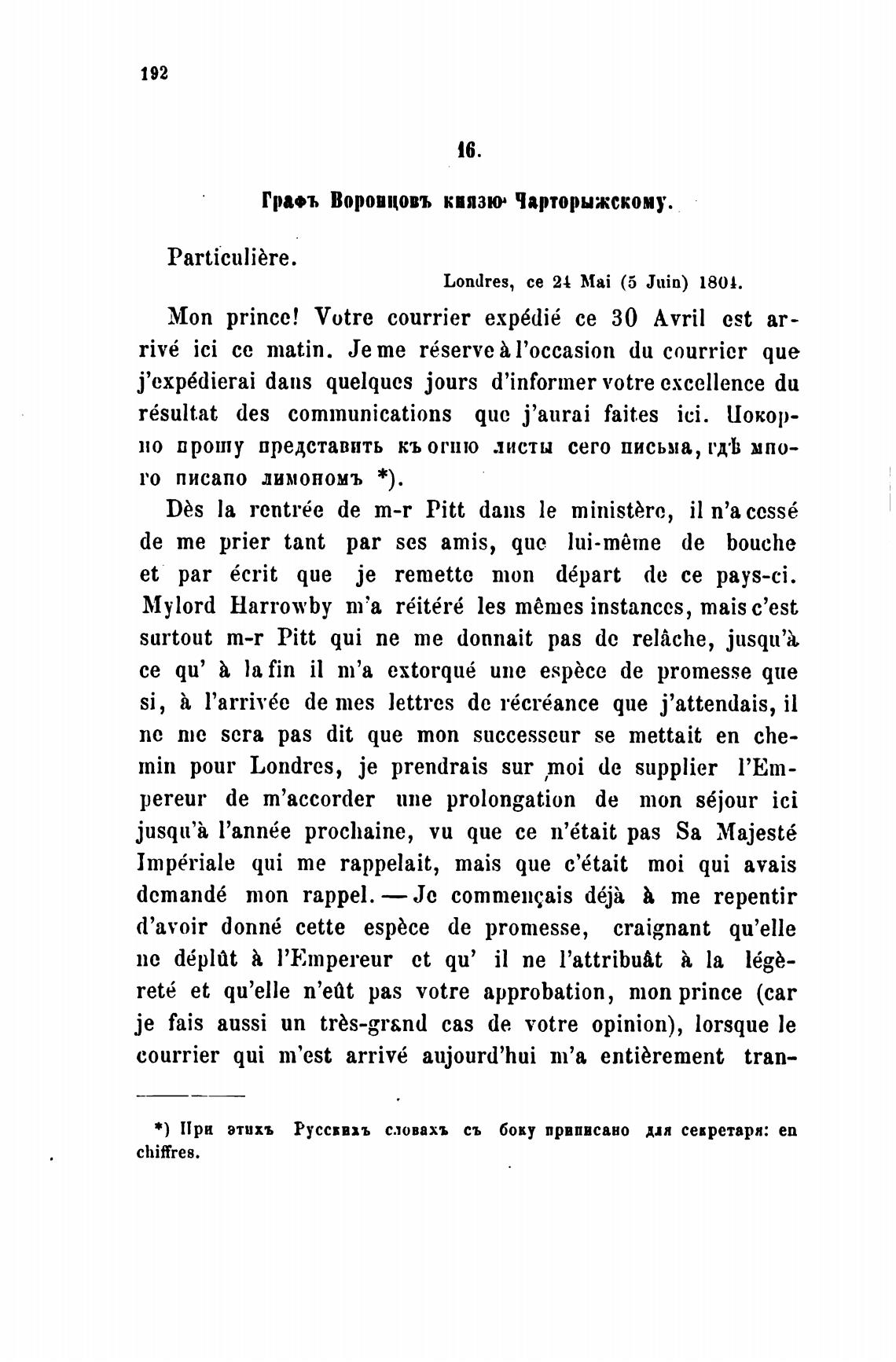 Гра•ъ Воровцовъ киязю• Чарторыжскому.