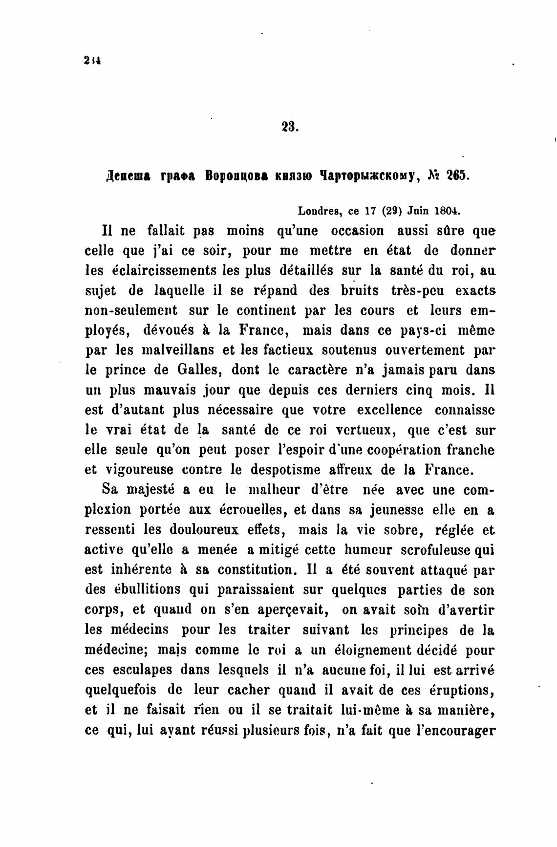 Депеша граэа Воропцова князю Чарторыжскому, Х2 265.