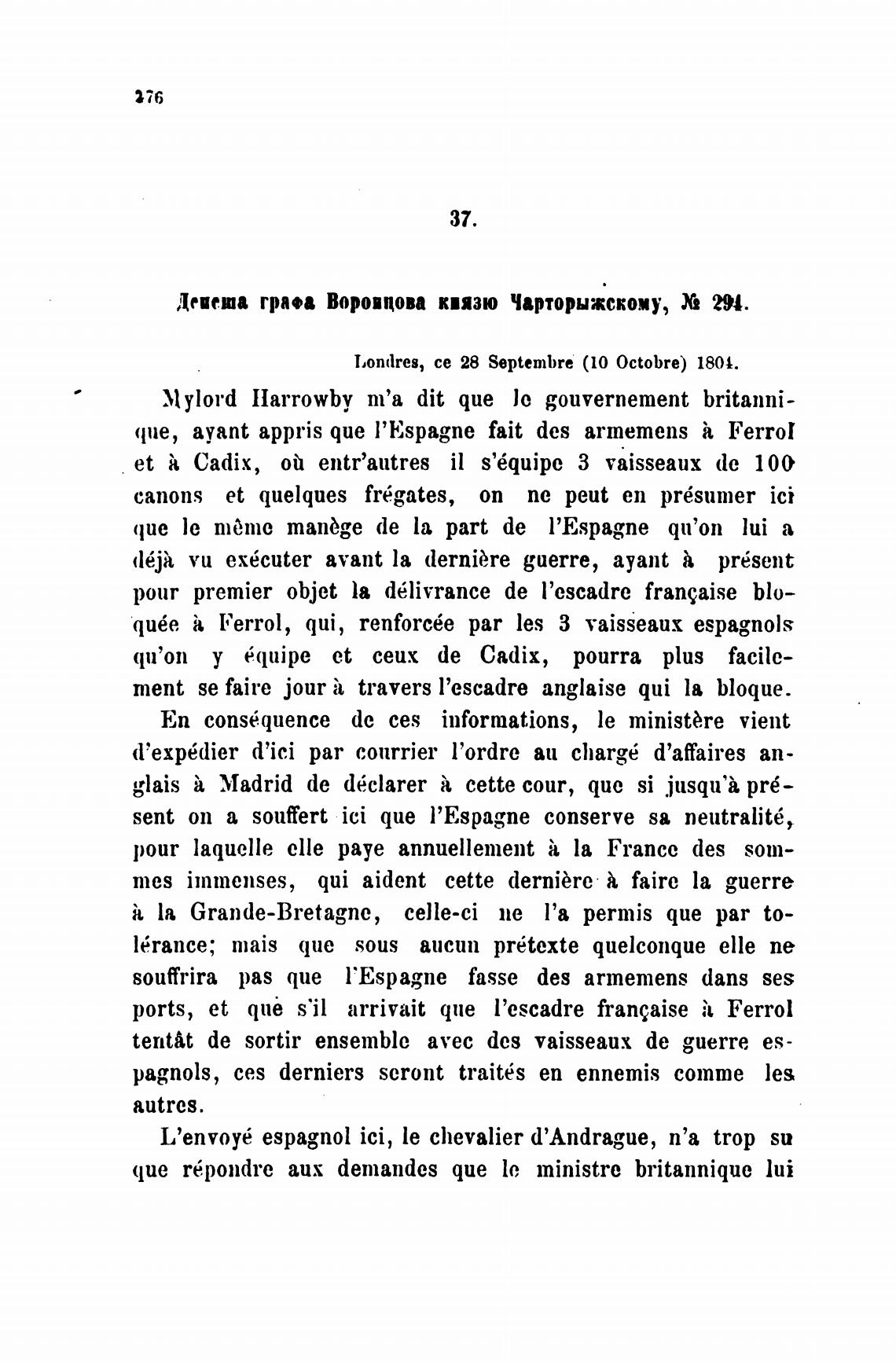 Депеша граи Воровцова киязю Чарторыжскому, 294.