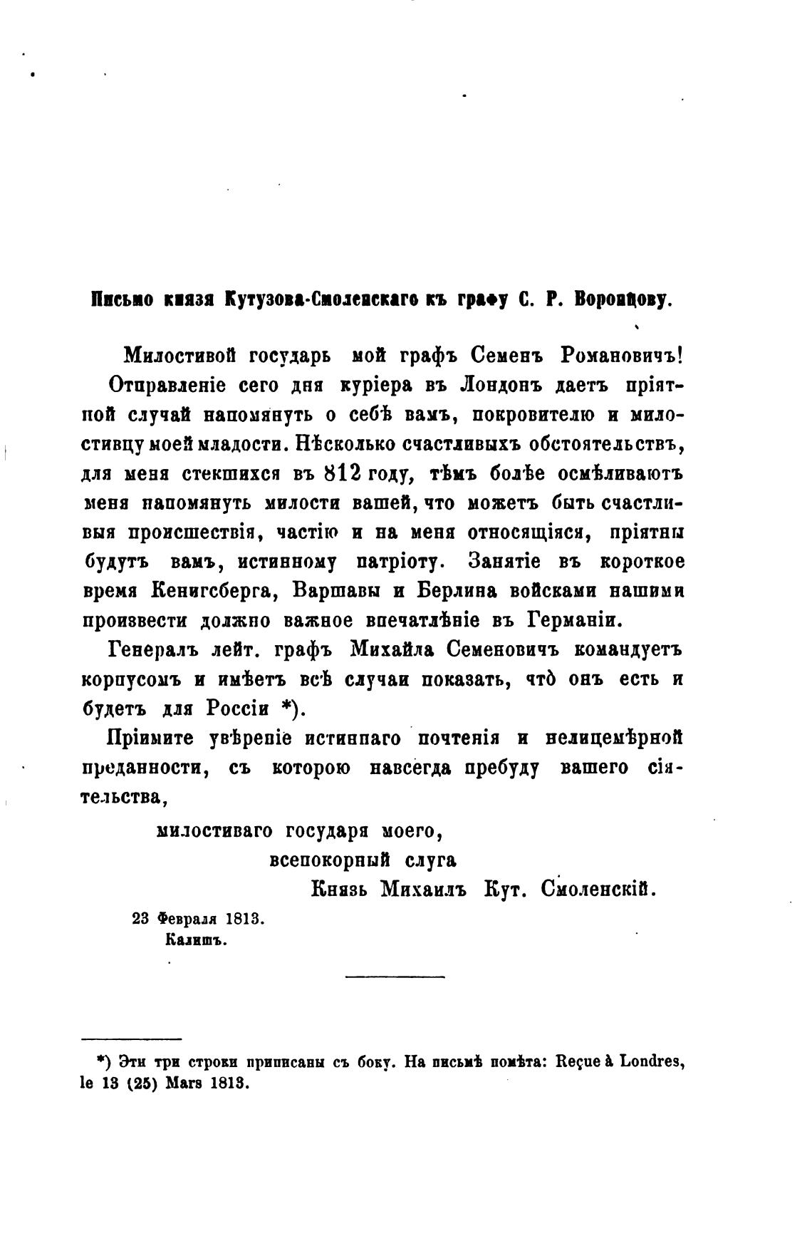 Ппсьио киязя Кутузова•свозевскаго кь гра•у С. Р. Вороваову.