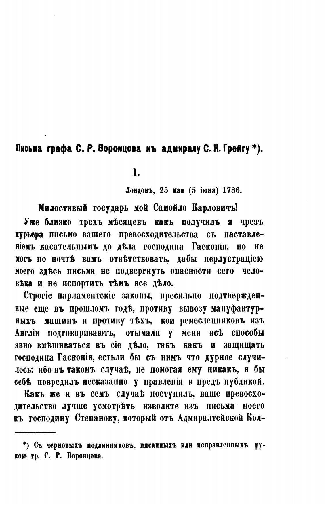 Письп графа С. Рв Воронцова кь адиириу С. К. Григу