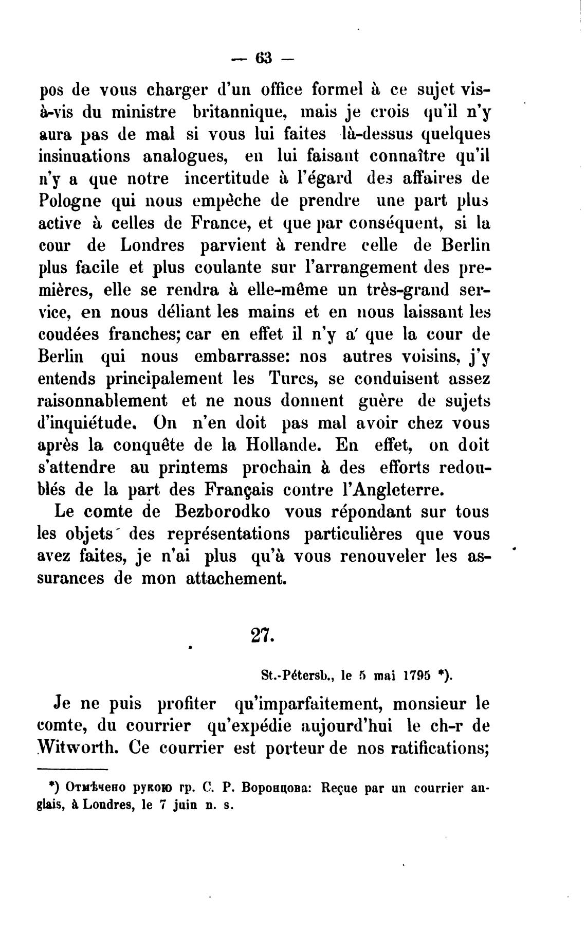 3) Отмжено рукою гр. С. Р. Воронцова: Recue рат ип courrier ап-