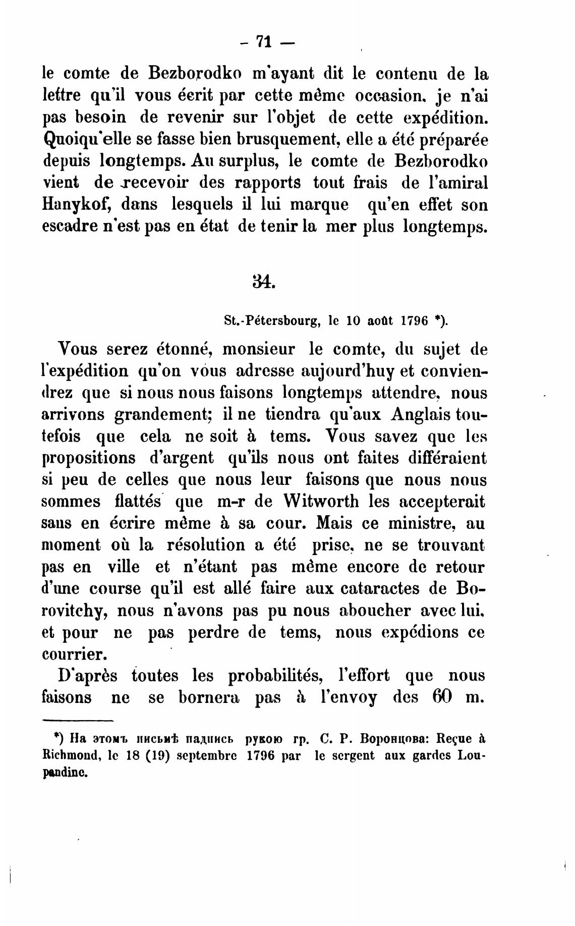 *) На этомт, письмт падиись рукою гр. С. Р. Воронцова: Recue
