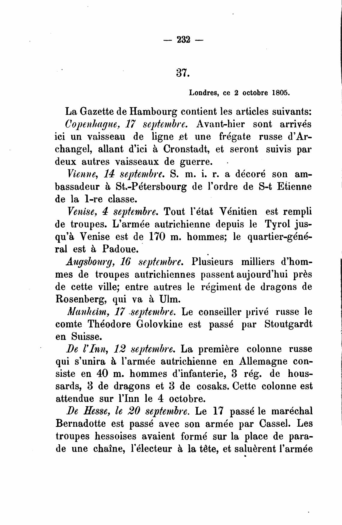 La Gazette de Hambourg contient les articles suivants: