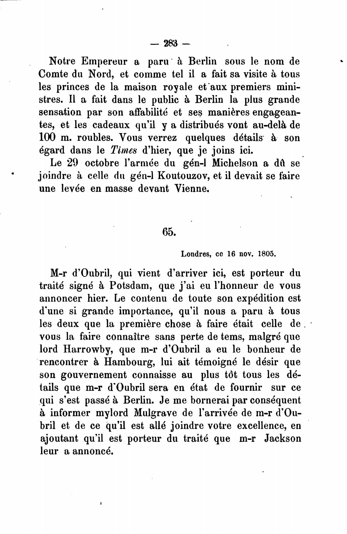 M-r d'Oubril, qui vient d'arriver ici, est porteur du