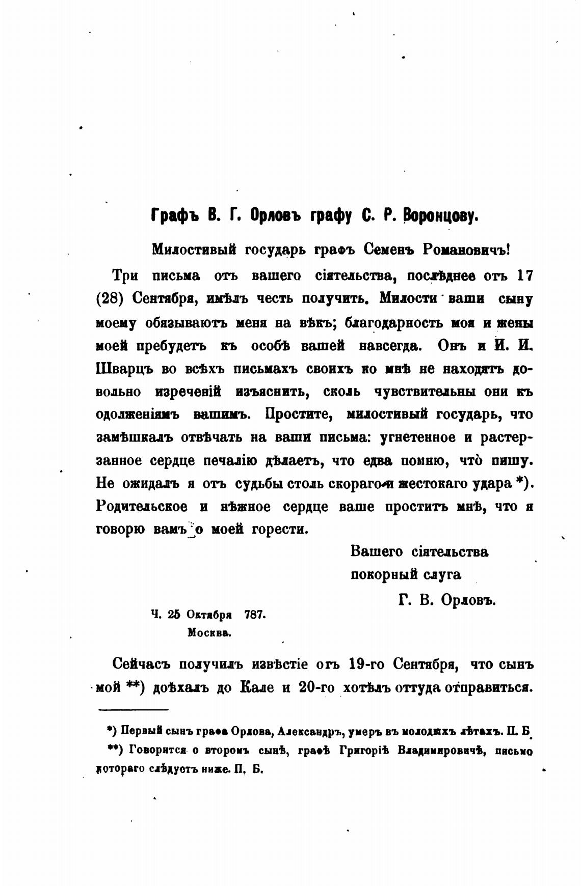 Графъ В. Г. орловъ графу С. Р. Воронцову.