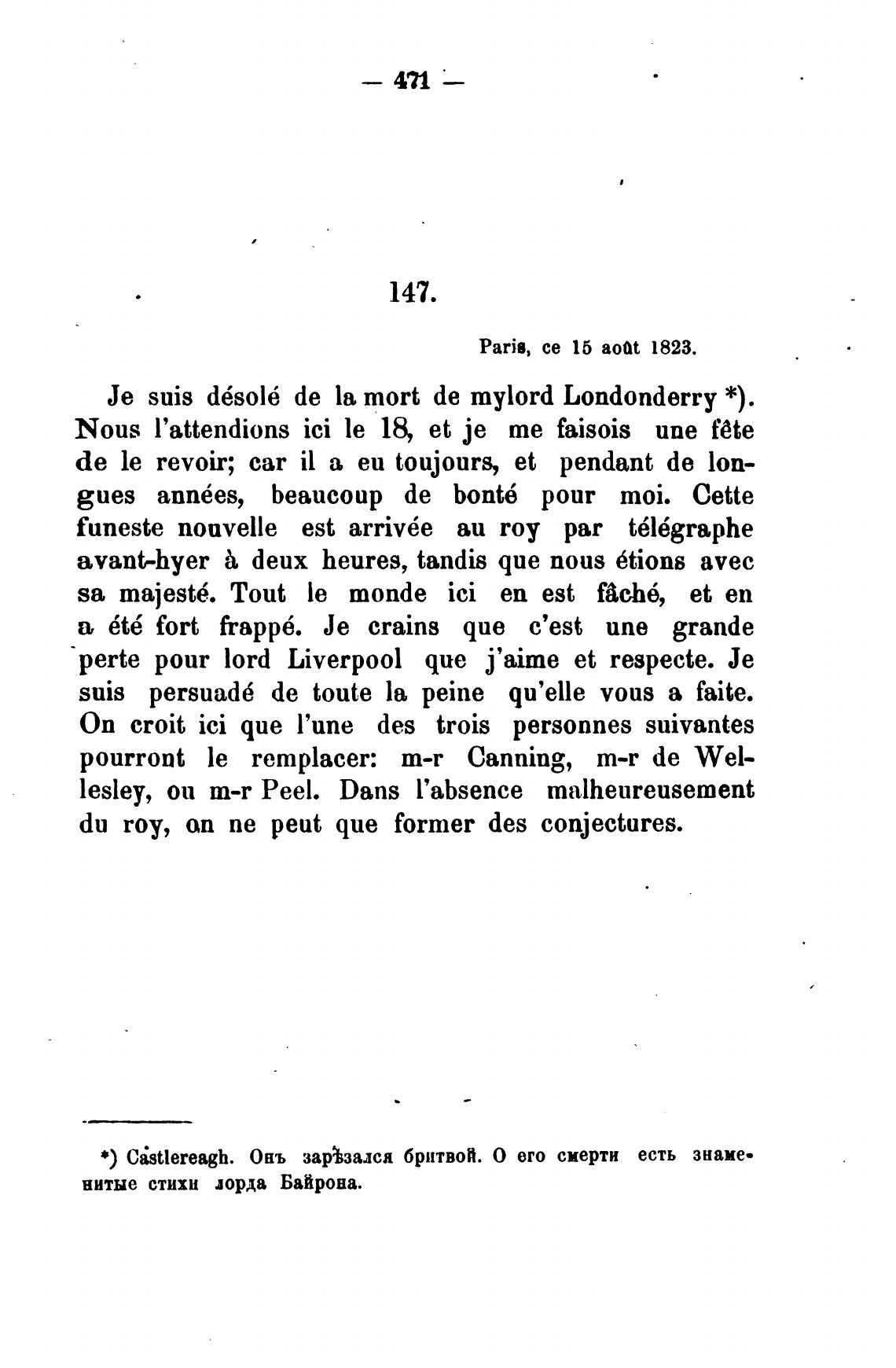 Је suis d6sol6 de la mort de mylord Londonderry *).