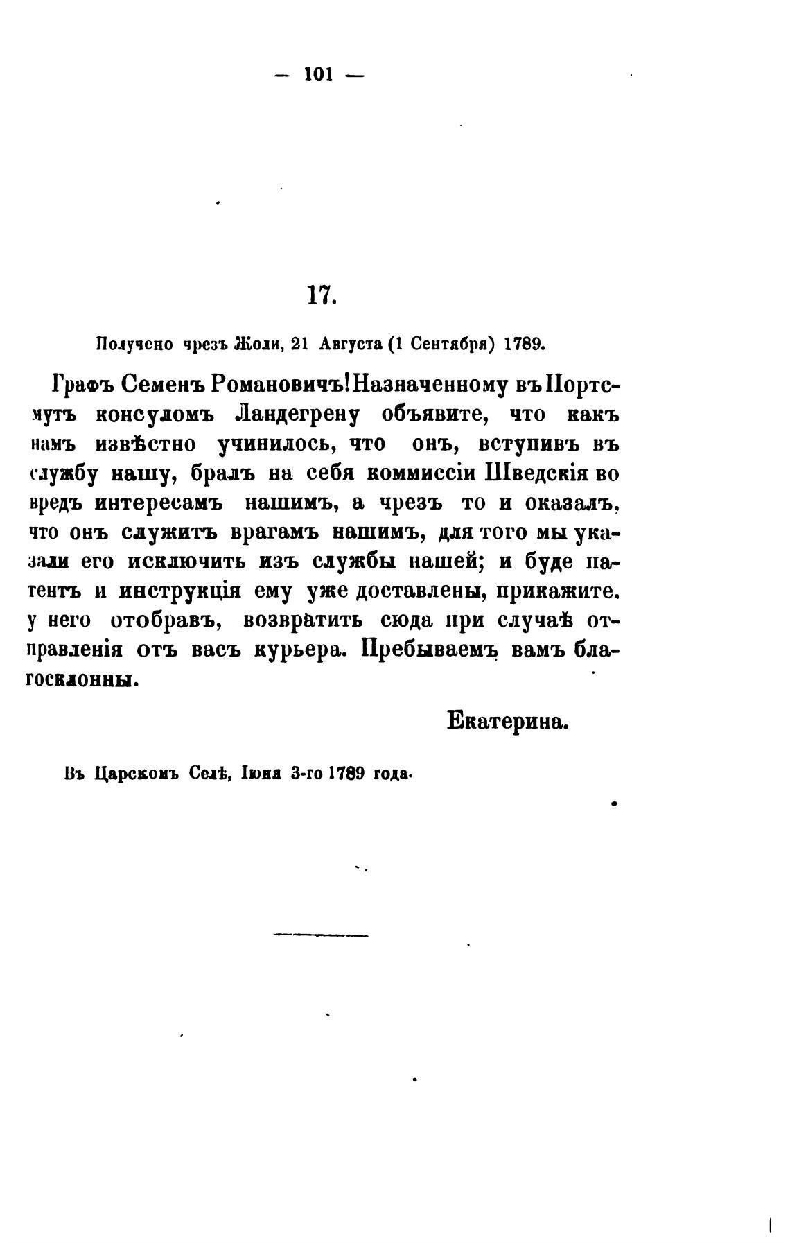 Получено чрезъ Жоп, 21 Августа (1 Сентября) 1789.