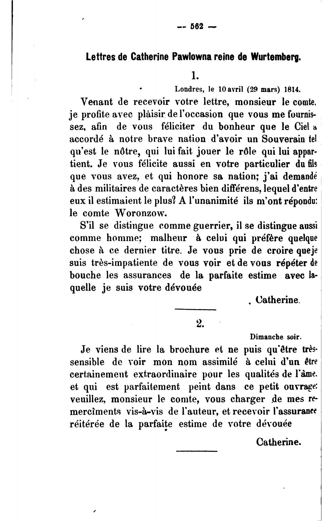 Lettres de Catherine Pawlowna reine de Wurtemberg.