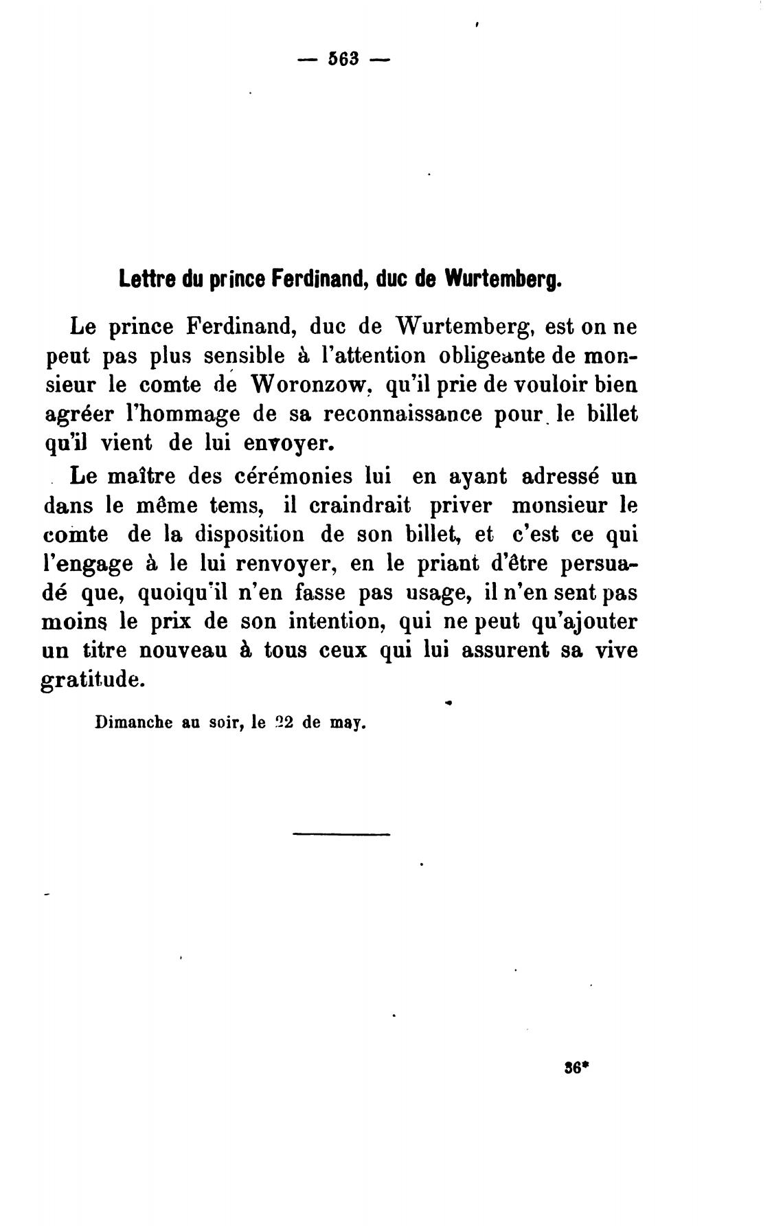 Lettre du prince Ferdinand, duc de Wurtemberg.