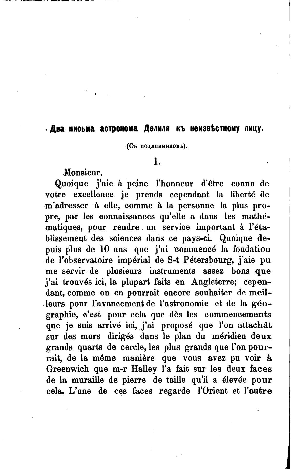 Два письма астронома делиля кь неизв%стному лицу.
