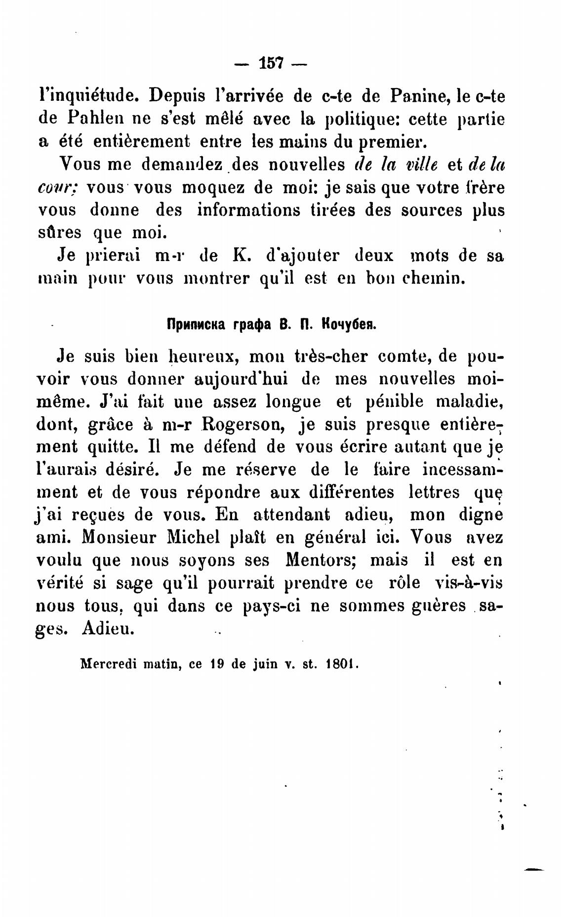 Mercredi matin, се 19 de juin У. st. 1801.