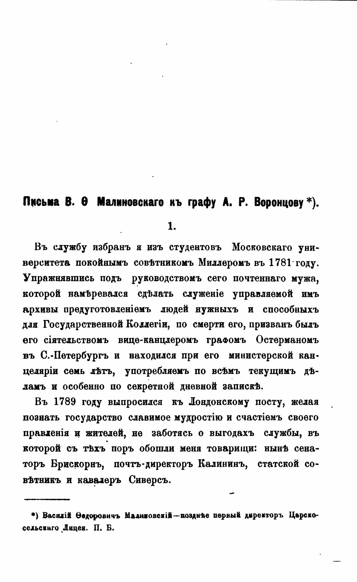 Ппсьп В. е Малиновскаго кь графу А. Р. Воронцову *).