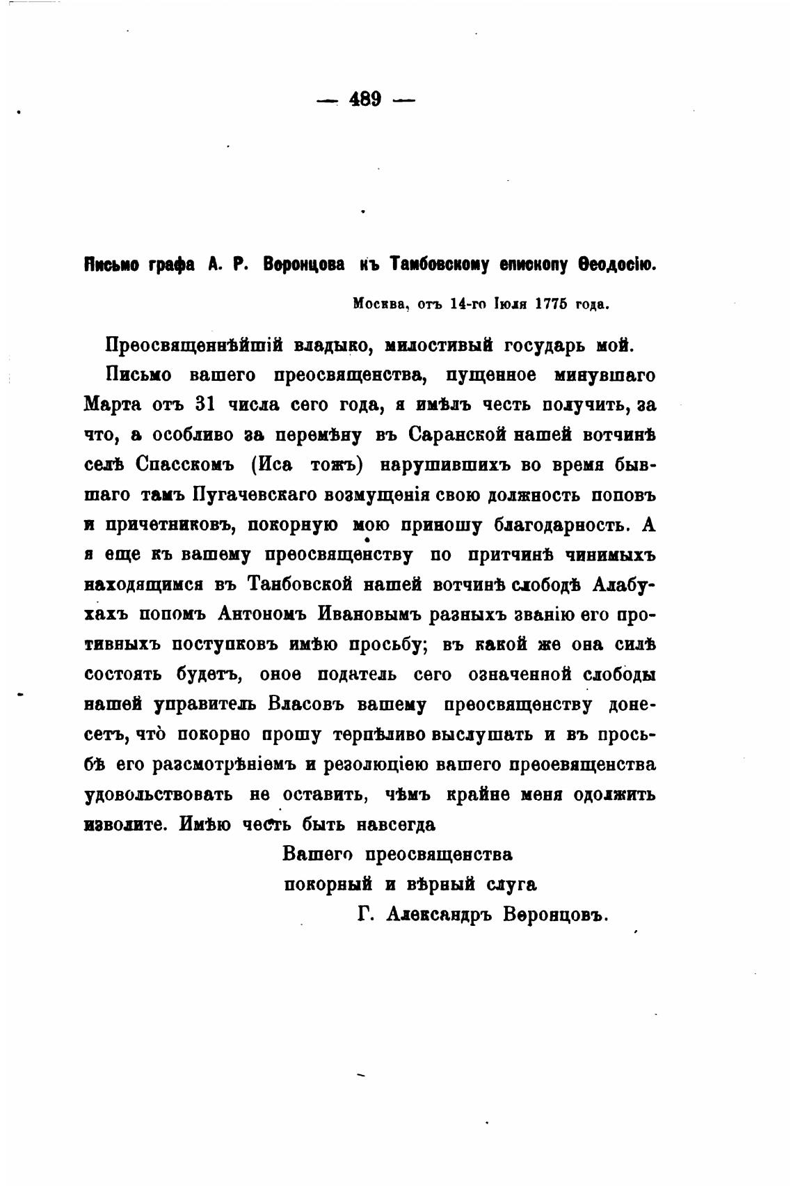 Я»ио графа А. Р. Воронцова кь Таибовскоиу ипкопу eeoAocio.