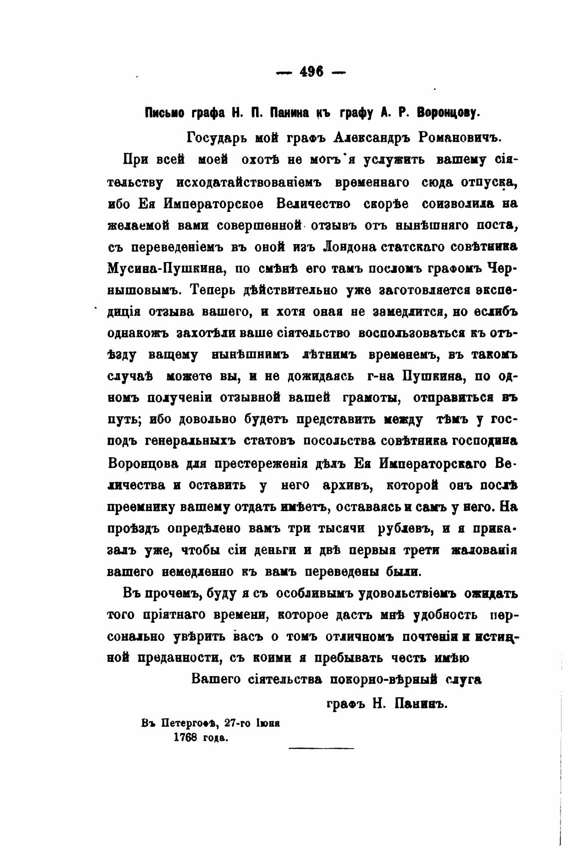 Письио графа Н. П. Лиина кь графу А. Р. Воронцову.