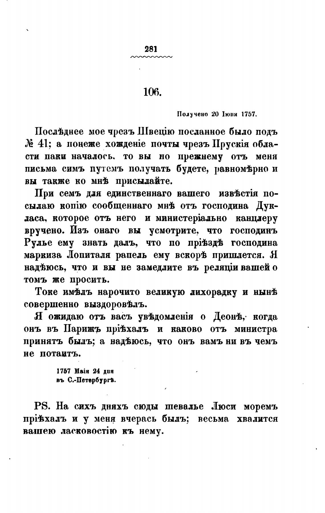 PS. На сихъ дняхъ сюды шевалье Люси моремъ