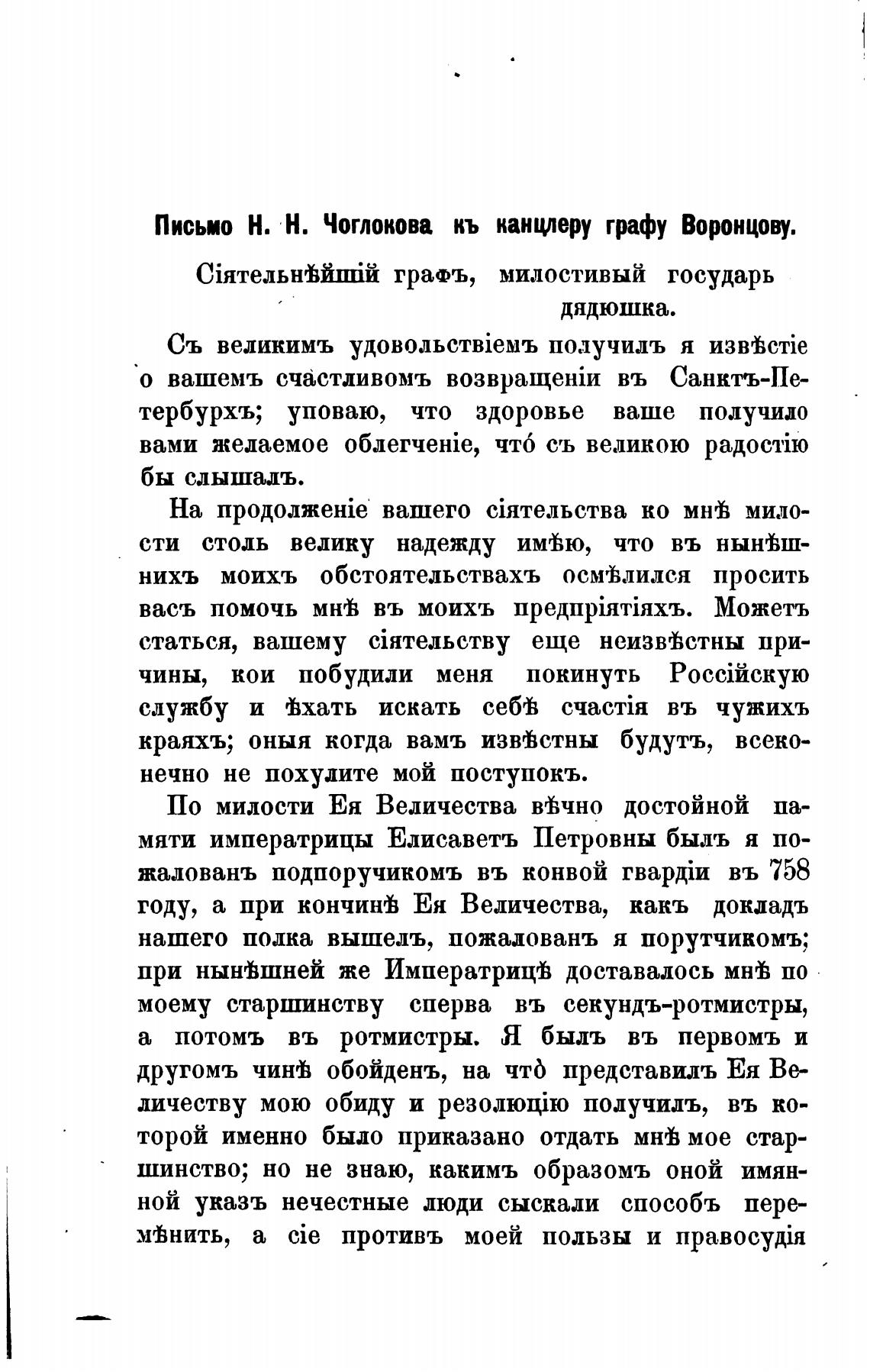 Письмо Н. Н. Чоглокова кь канцлеру графу Воронцову.