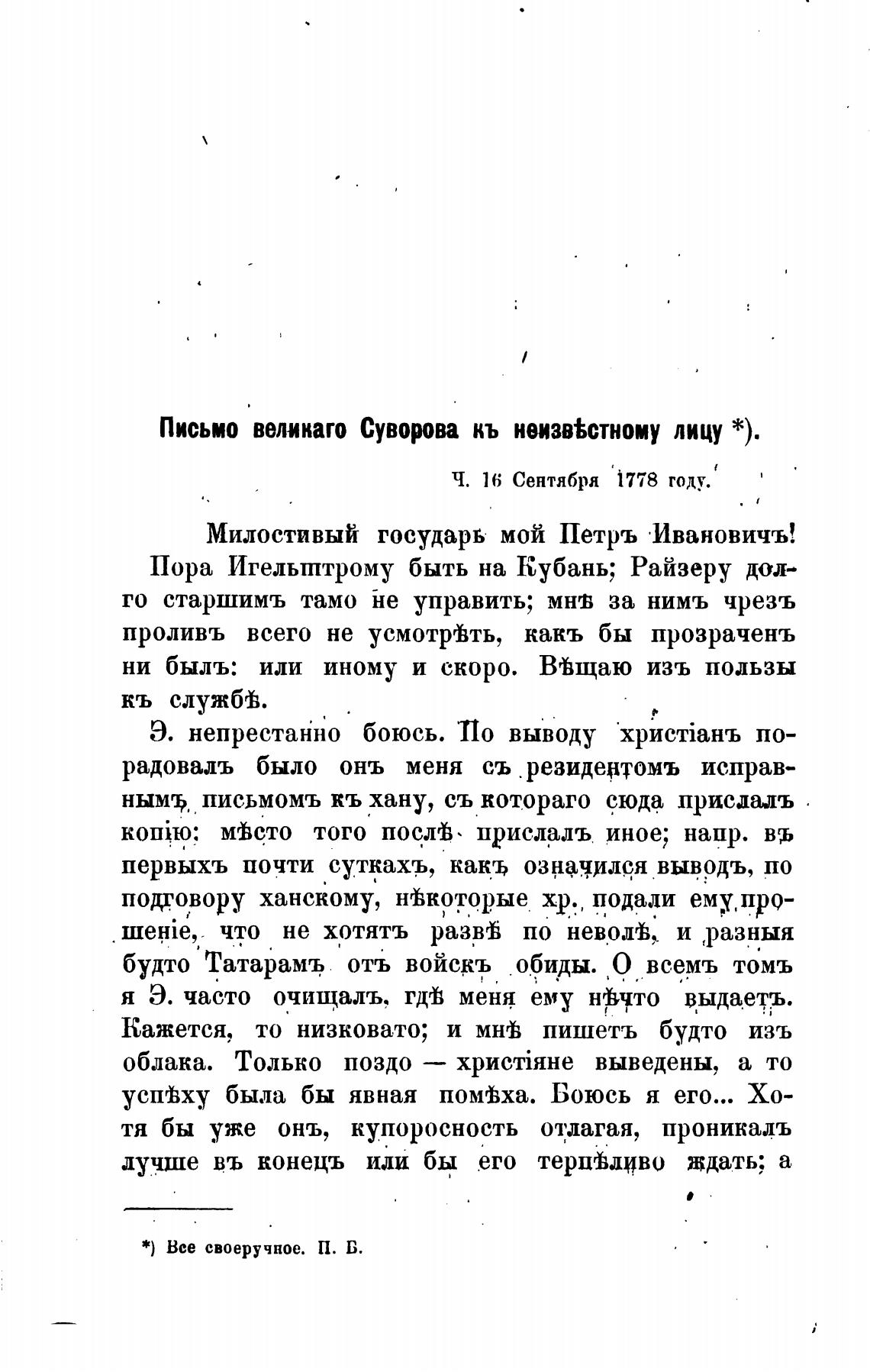 Письмо великаго Суворова кь неизв%стному лицу *).