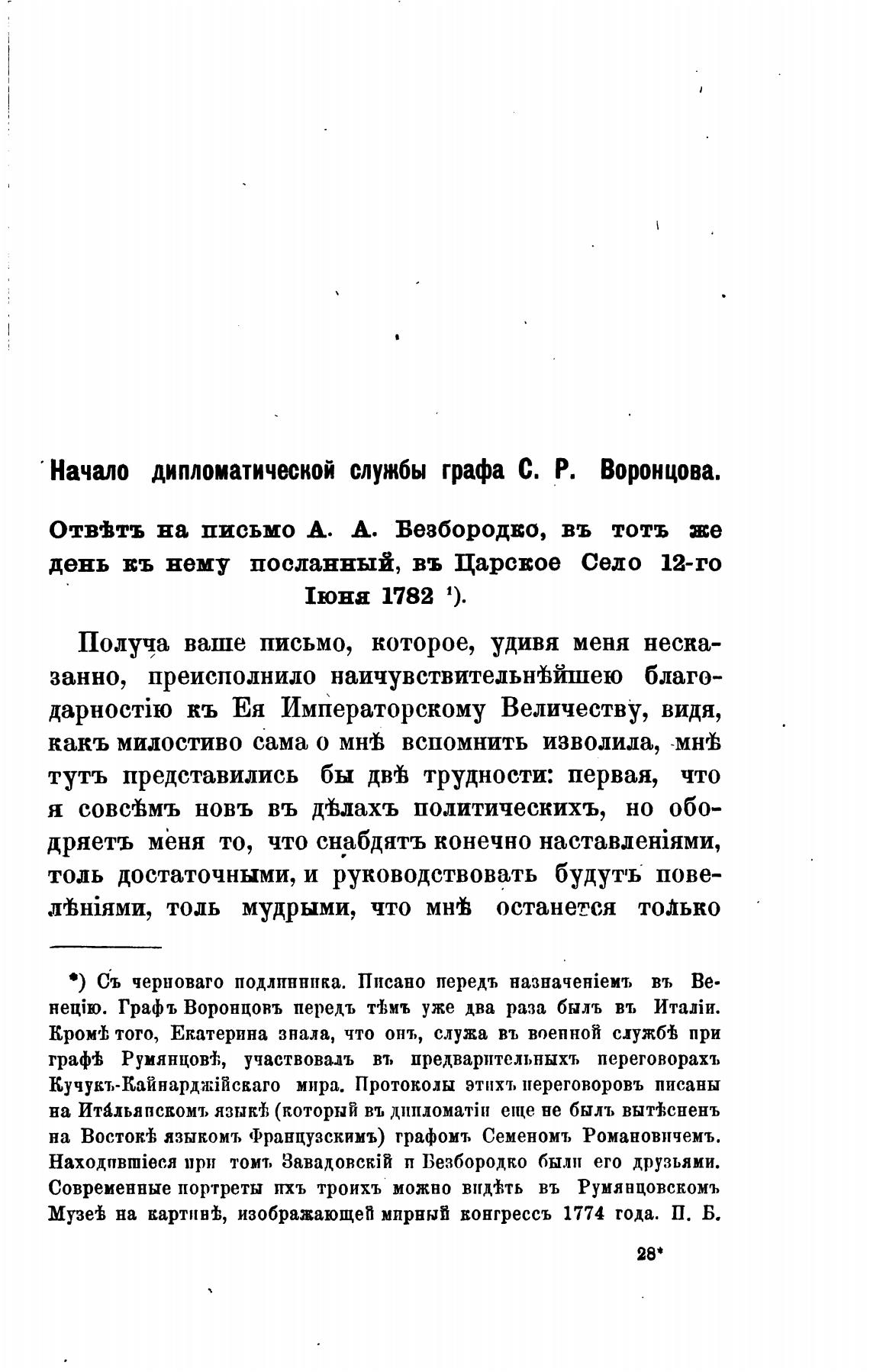 Начало дипломатической службы графа С. Р. Воронцова.