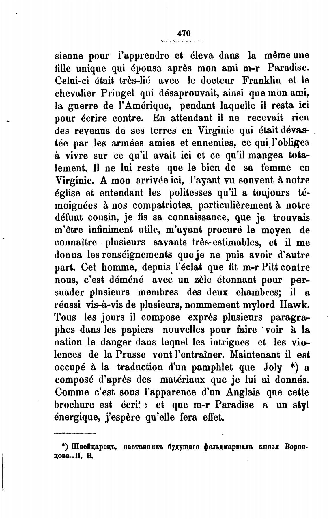 * ) Швейцарецъ, наставнивъ будущато фельдмаршала вняза Ворон.