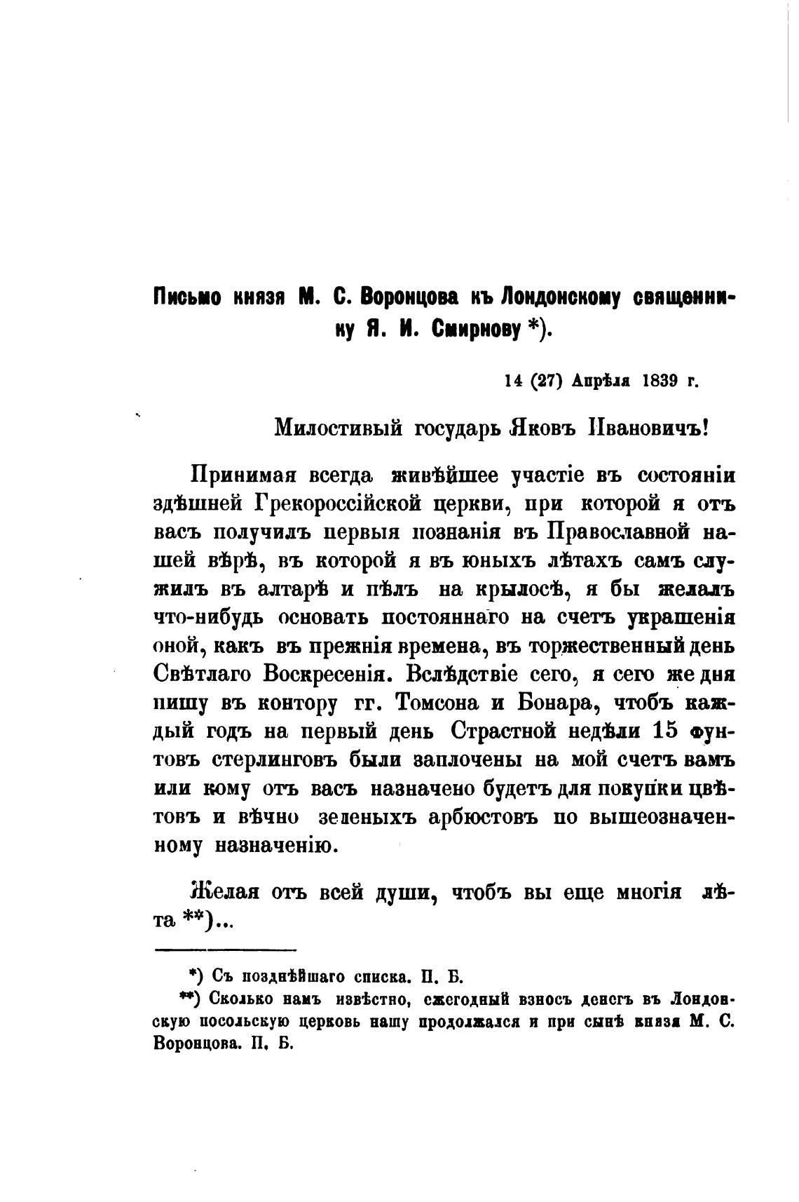 Письмо князя М. С. Воронцова кь Лондонском священни-