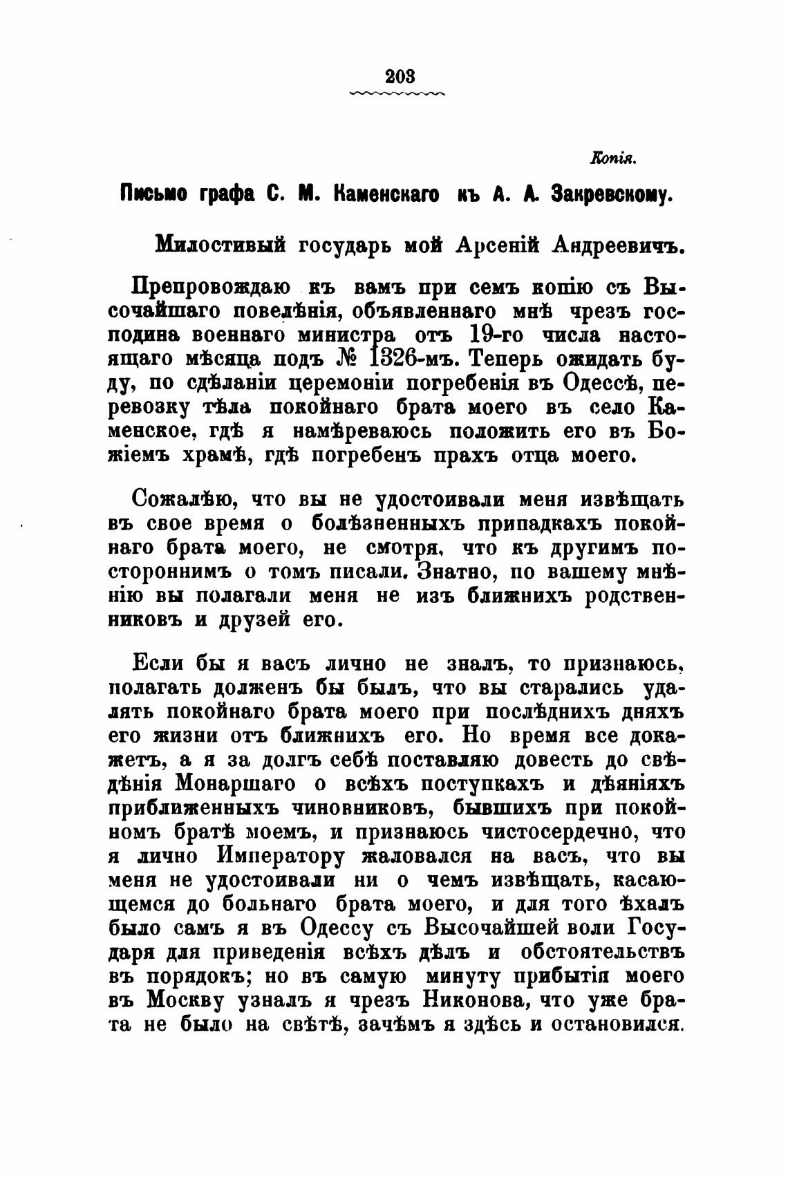 Ппьио графа С. М. Каменскаго кь А. Закревскому.