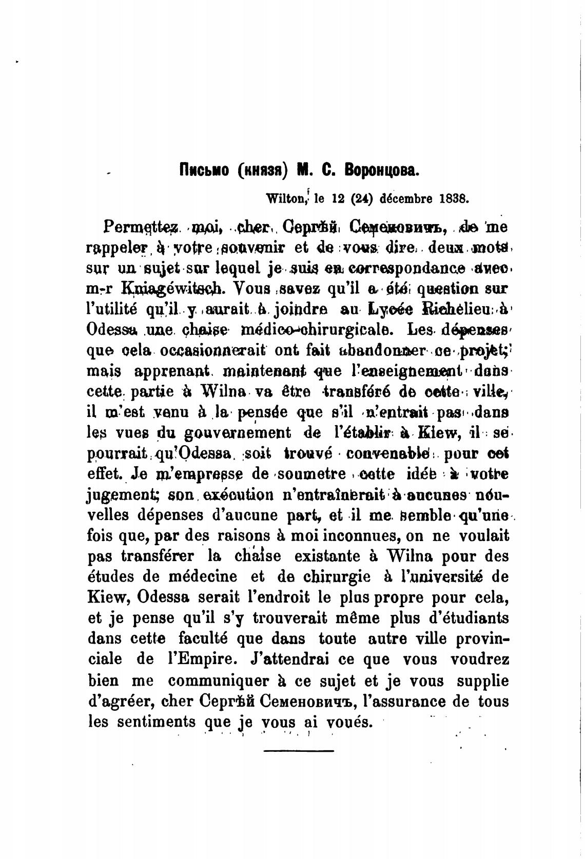 Письмо (князя) М. С. Воронцова.