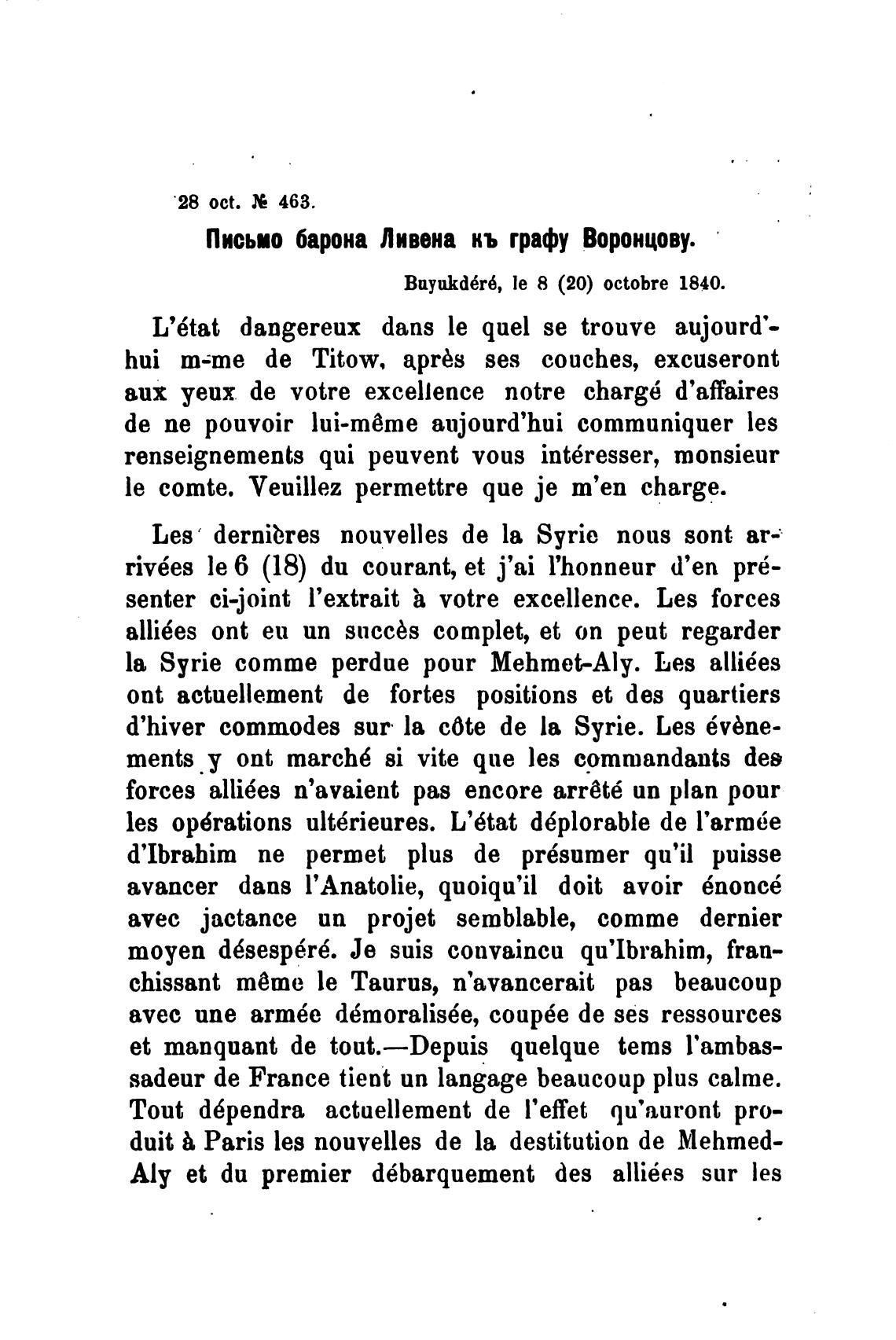 Письмо барона Ливена кь графу Воронцову.