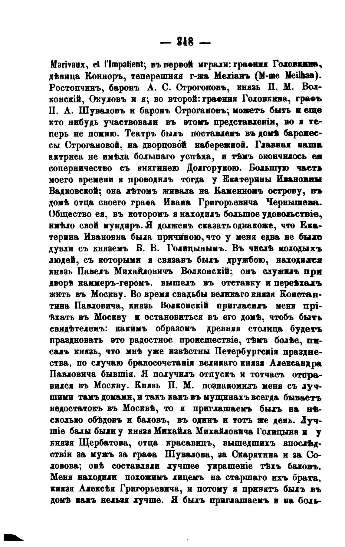 конскТ, Окуловъ и я; во второй: гра•иня Головкина, грв•ъ