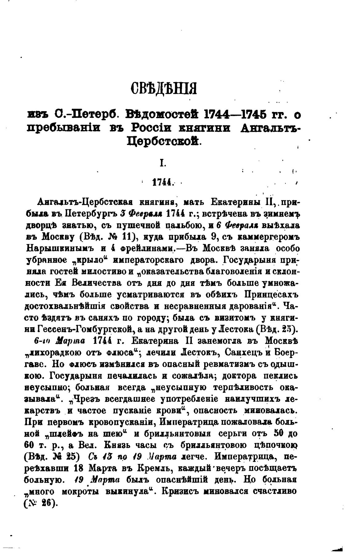6-0 Марта 1744 г. Екатерина занемогла въ Ш)сквВ