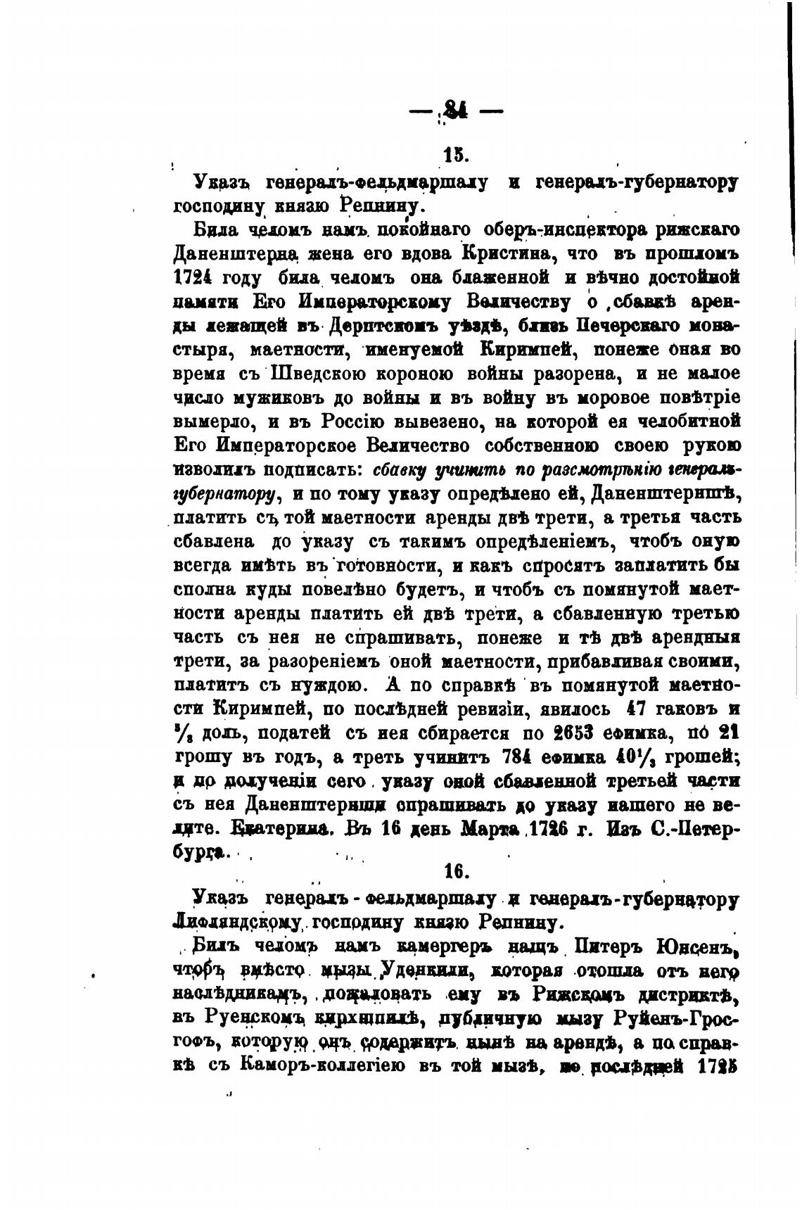 дџте. Евтери.на, Въ 16 день Марта „1726 г. Ивъ C.-11eNp-