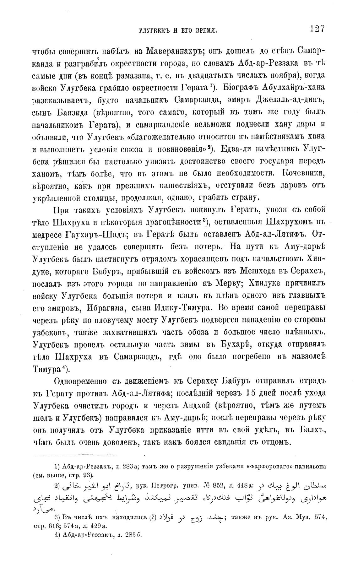 1) Абд-ар-Реззакъ, л. 283а; тамъ же о разрушекйи узбеками павильона