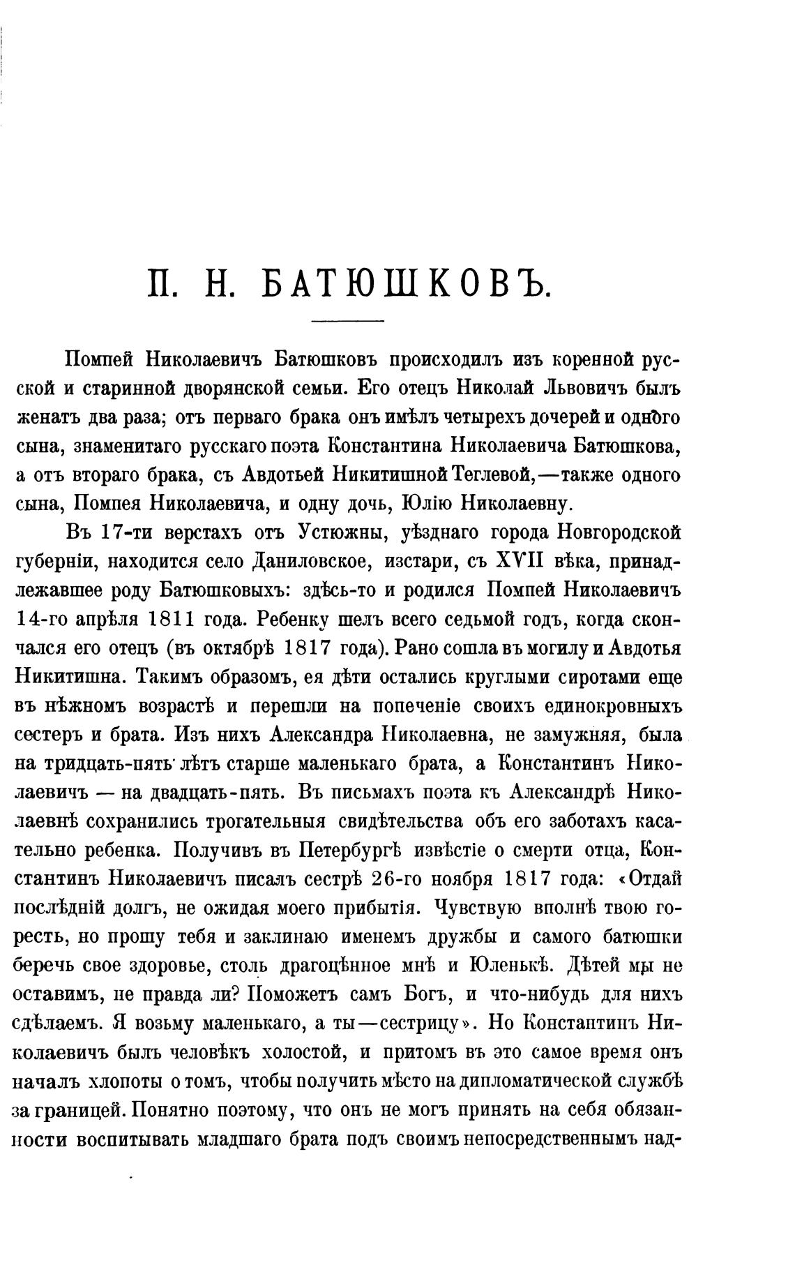 Помпей Николаевичъ Батюшковъ происходилъ изъ коренной рус-
