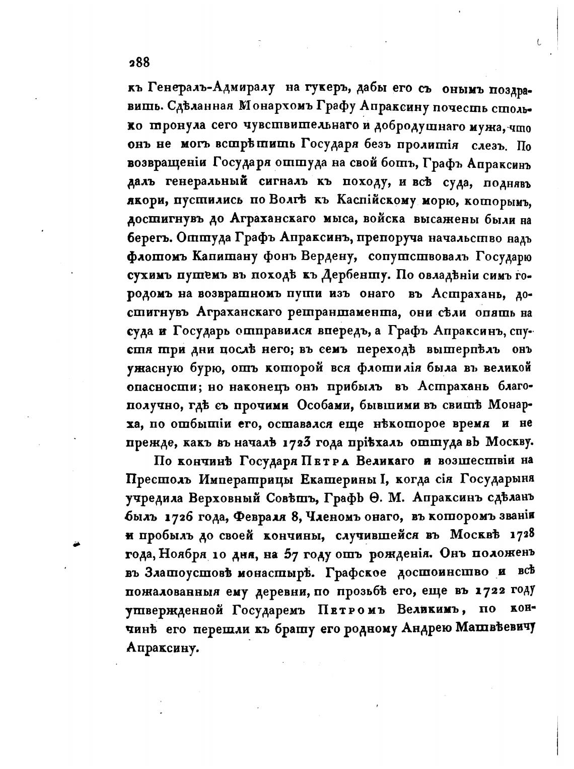 суда и Государь отправился вперевъ, а Графъ Апраксинъ, спу••
