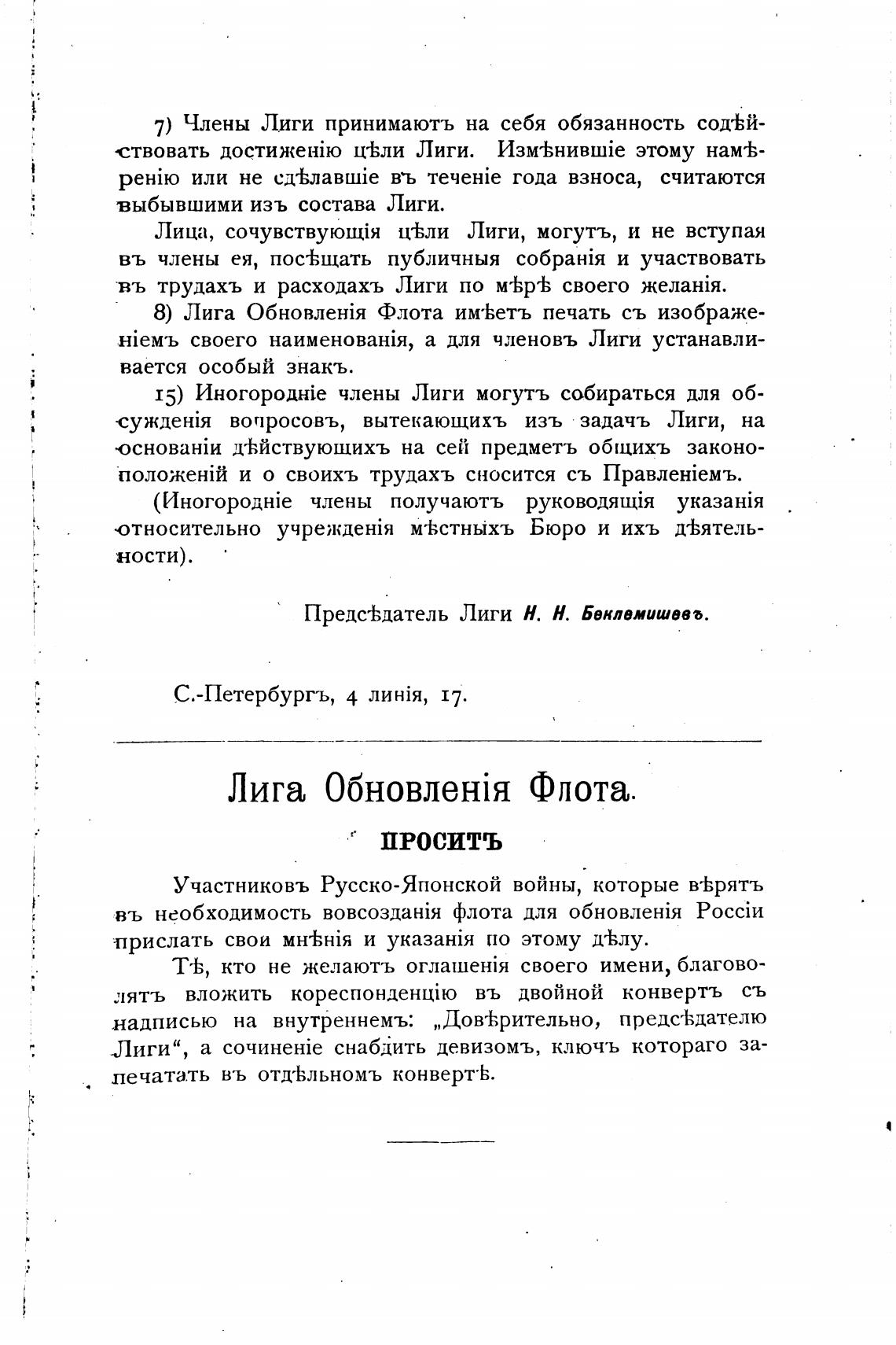 Предс±датель Лиги Н. Н. Беклемишева.