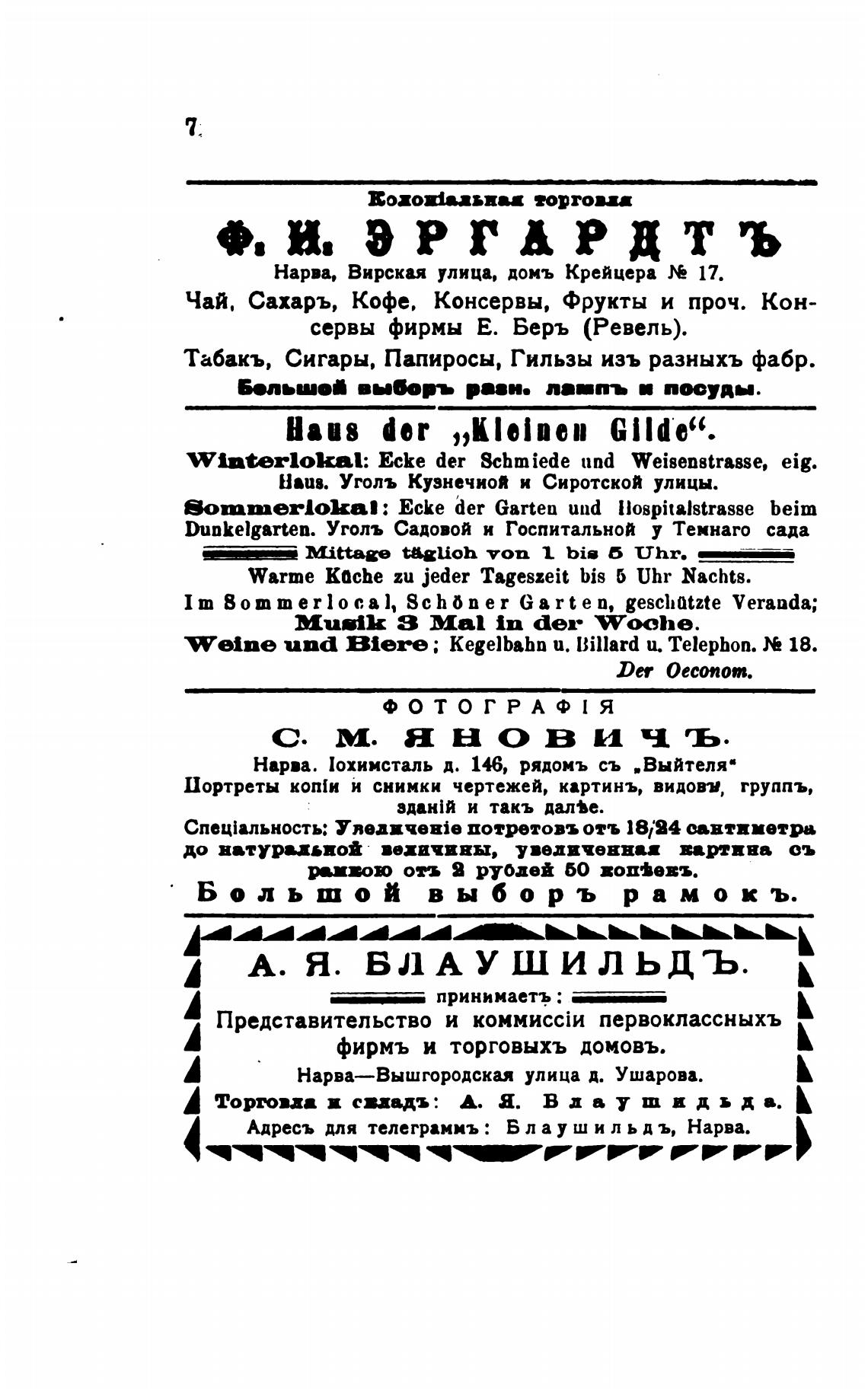 Адресъ для телеграмиъ: Б л а у ш и л ь д ъ, Нарва.