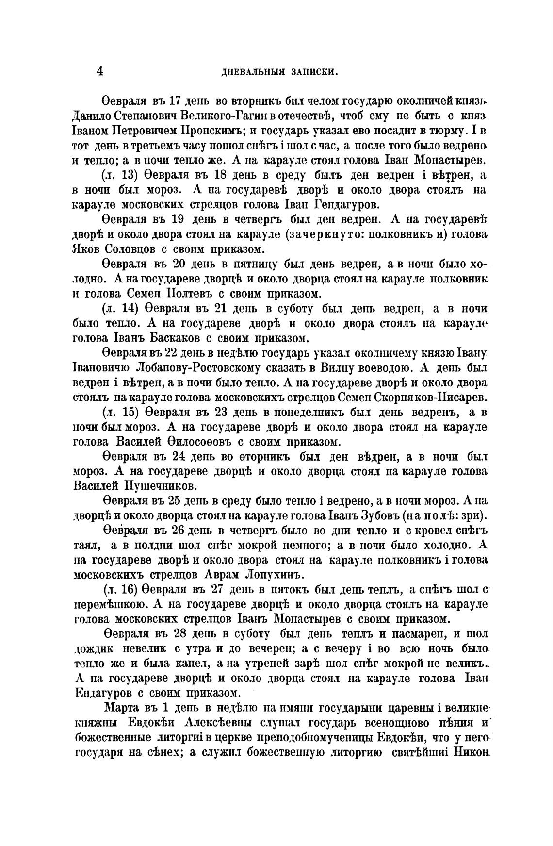 (л. 13) Оевраля въ 18 день в среду быль ден ведрен i в•Ьтрен, а