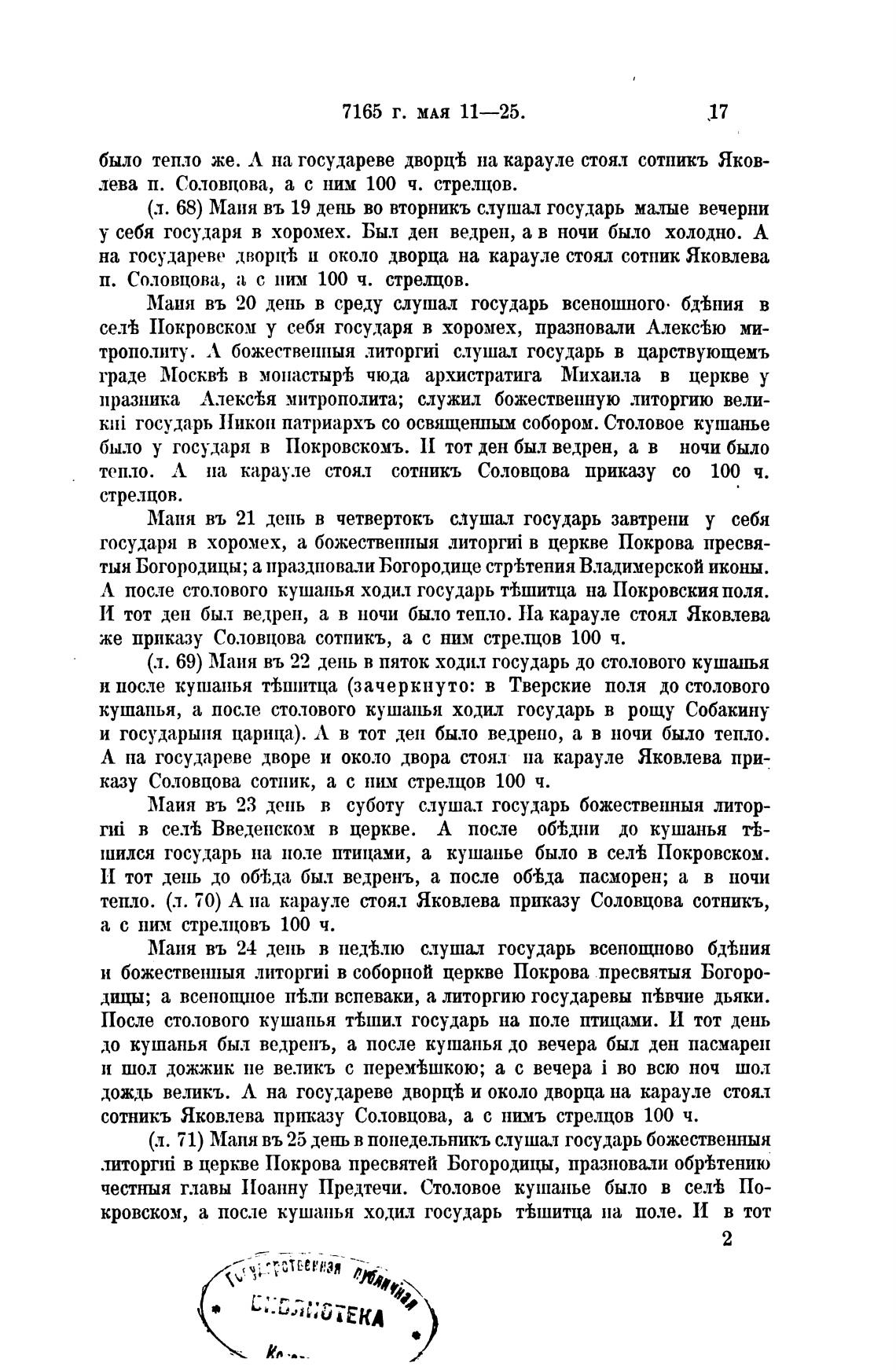 тепло. (л. 70) А на карауле стоял Яковлева приказу Соловцова сотникъ,
