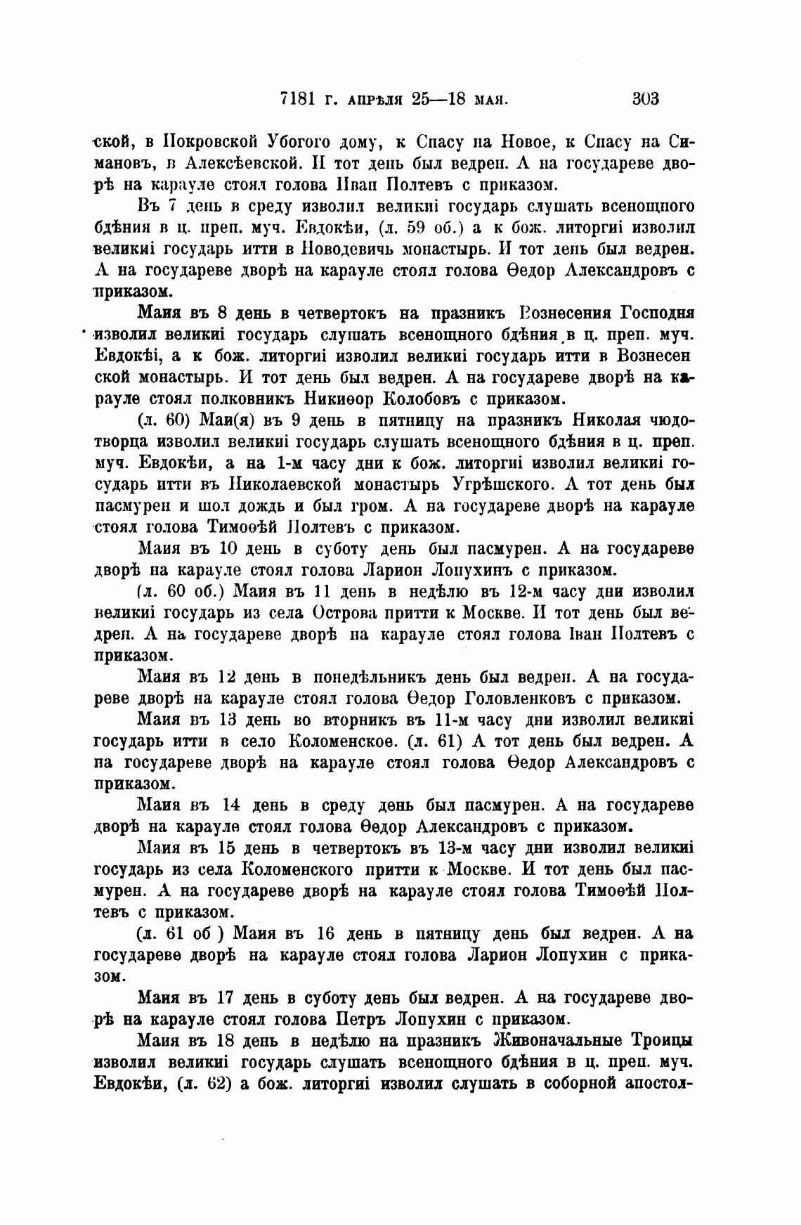 государь итти в село Коломенское. (л. 61) Л тот день был ведрен. А