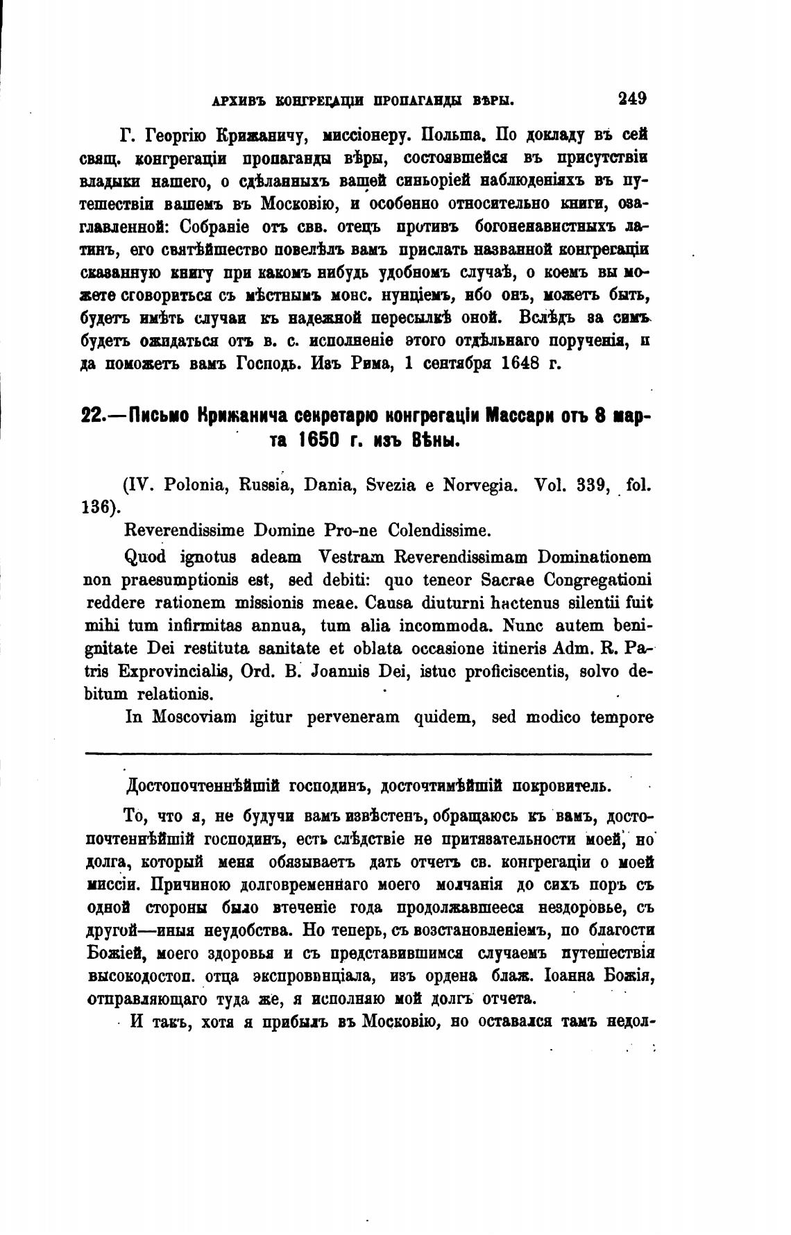 22.—Письио Крижанича секретарю конгрегац\и Массари отъ 8 пр-