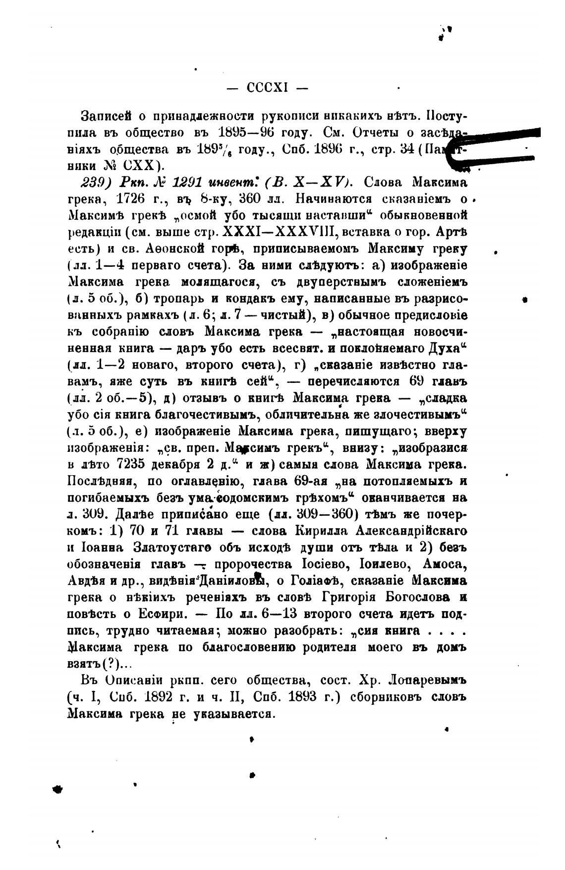 239) РКП. Л: 1291 инвент.• (В. Х— ХУ). Сдова Максима