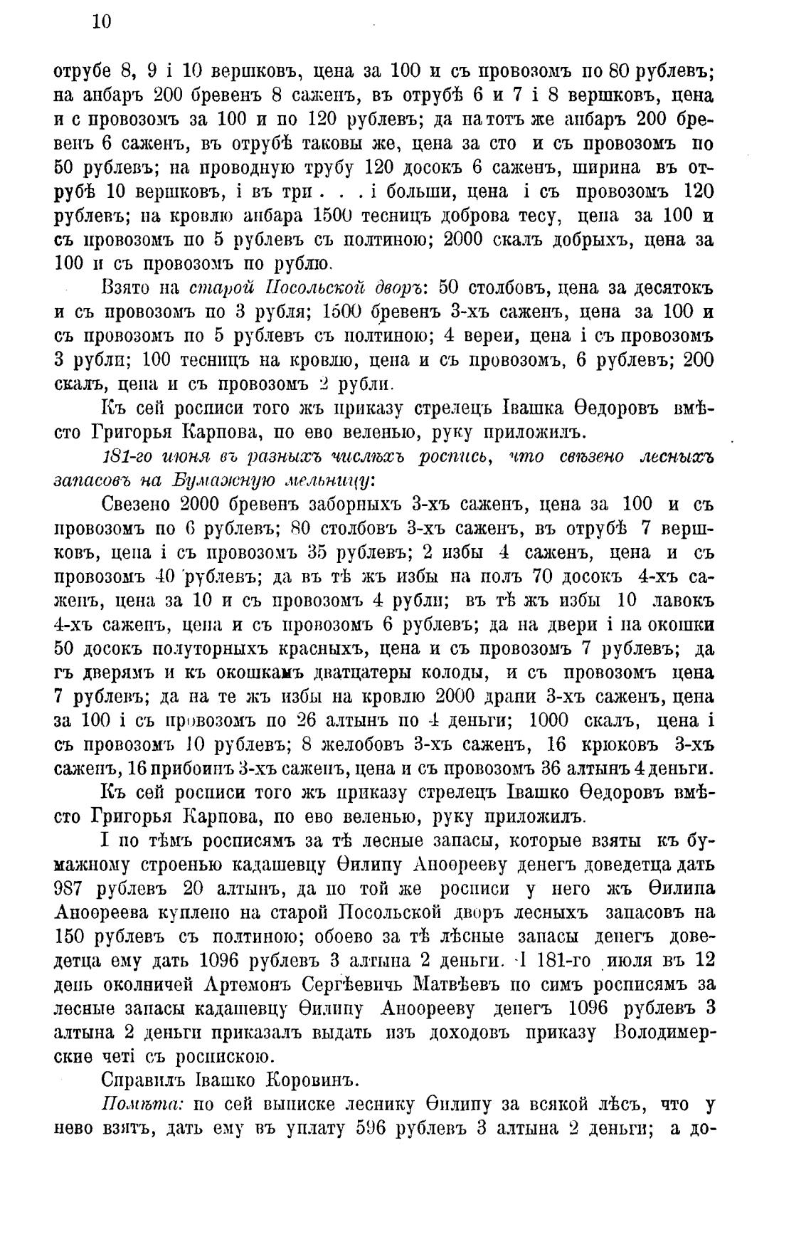 сажень, 16 прибоипъ 3-хъ сажень, цена и съ провозомъ 36 алтынъ 4 деньги.