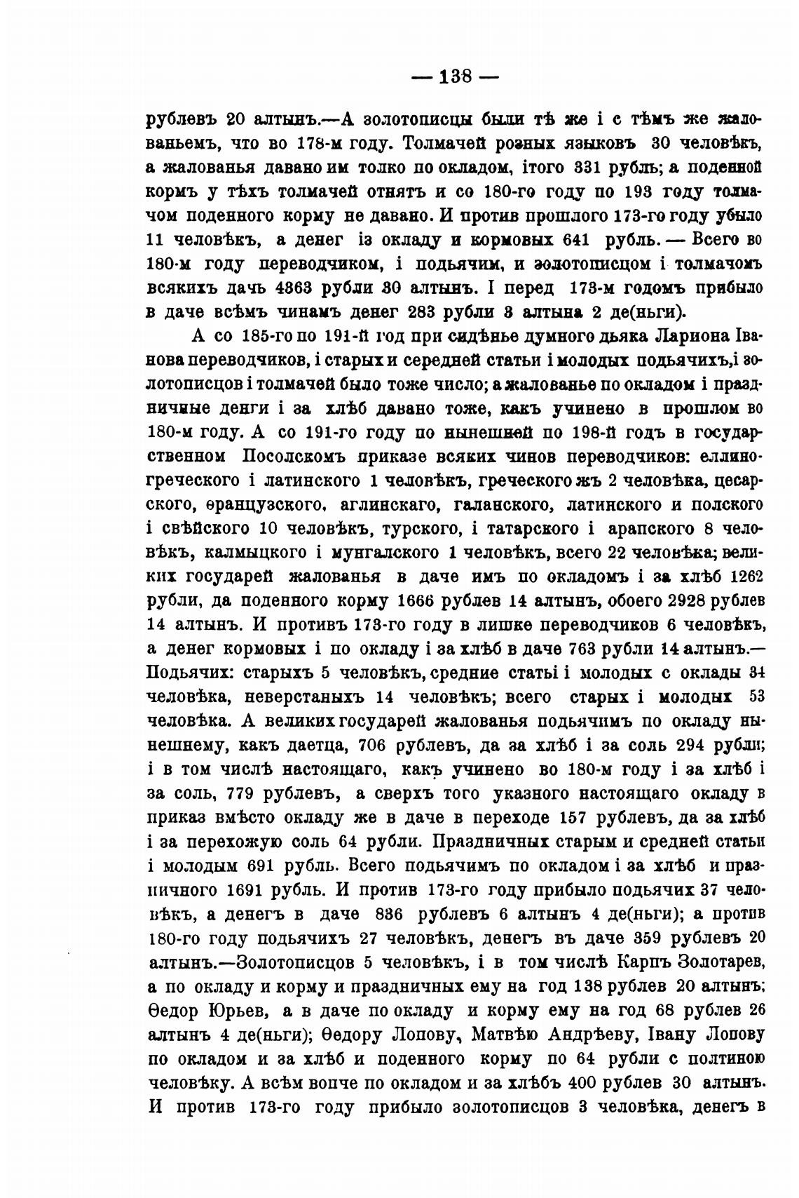 а по окладу и корму и праздничных ему на год 138 рублев 20 алтынъ;