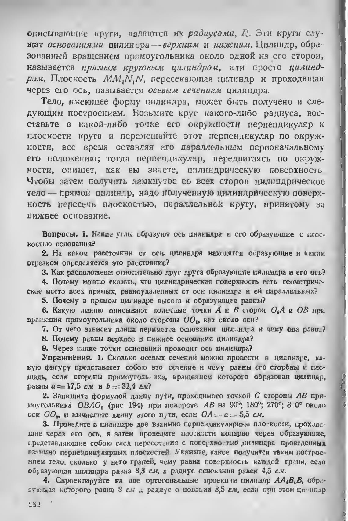 Вопросы. 1. Какие углы образуют ось цнлицдра н его образующие с плос-