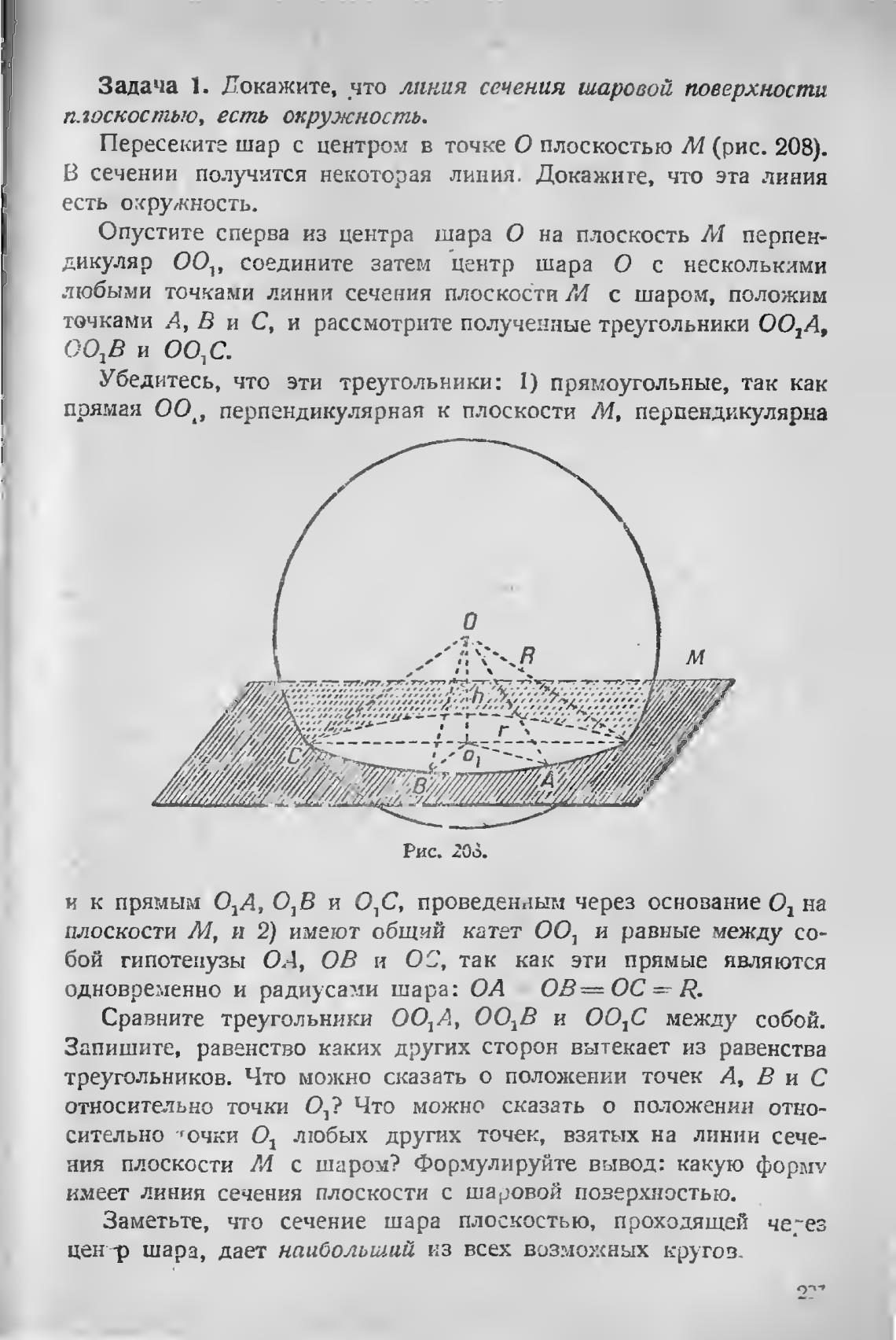 Пересеките шар с центром в точке О плоскостью М (рис. 208).